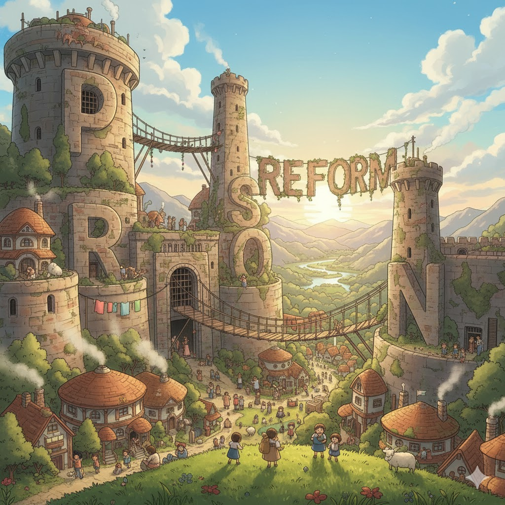 '교도소'(prison) '시스템'(system)의 '조건'(conditions), '관리'(management) '방식', '수감자'(inmates) '대우', 또는 '징역형'(sentence) '제도'에 '개선'(improvement)을 '가하기'(make) 위해 '취하는'(take) '정책적'(policy) 또는 '법적'(legal) '변화'(change)를 의미합니다. '재활'(rehabilitation), '인권'(human rights) '보호'(protection), 그리고 '재범'(recidivism) '감소'(reduction)를 '목표'(goal)로 합니다.