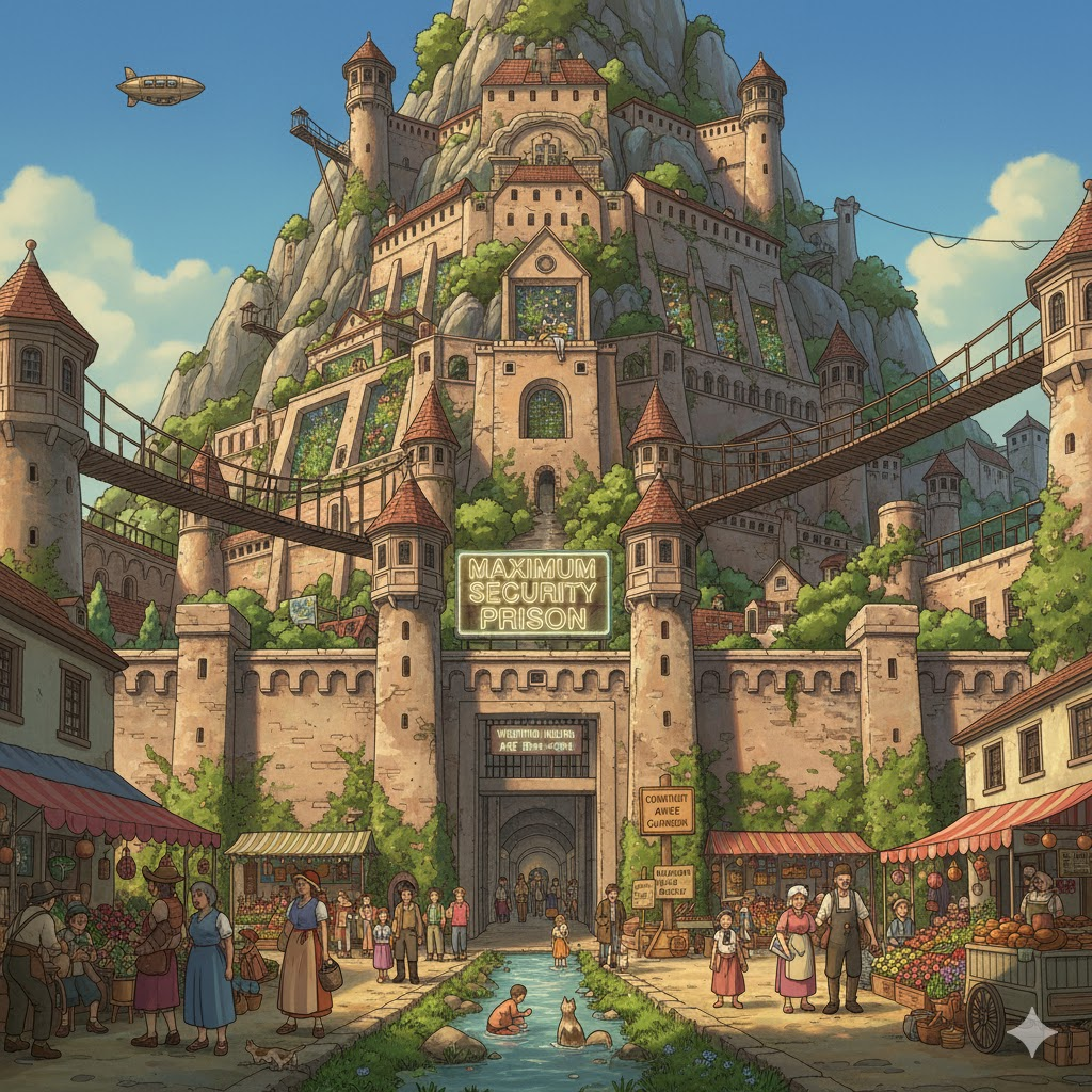 '탈출'(escape) 위험이 '가장'(most) '높거나', '극도로'(extremely) '위험한'(dangerous) '범죄자'(criminals)를 '수용'(contain)하기 위해 '최고'(maximum) '수준'(level)의 '보안'(security)과 '통제'(control)가 '적용'(apply)되는 '교도소'(prison)를 의미합니다. '자유'(freedom)가 '가장'(most) '엄격하게'(strictly) '제한'(restricted)된 '처벌'(punishment) 시설을 강조합니다.