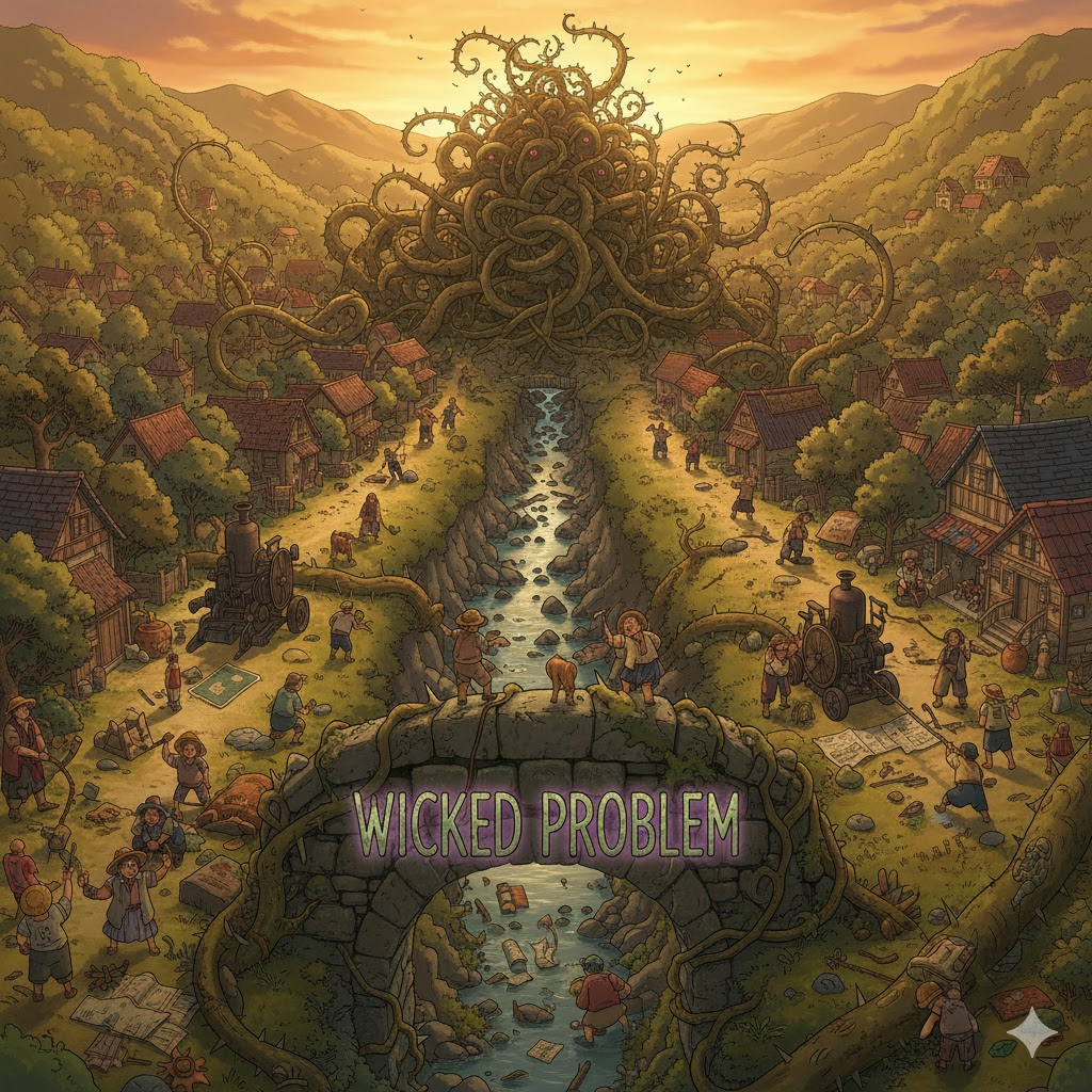 '문제'(problem)의 '정의'(definition) 자체가 '불안정'(unstable)하고, '해결책'(solution)이 '명확하지'(clear) 않으며, '하나'의 '해결'이 '다른'(other) '문제'를 '유발'(cause)하는 등 '복잡하고'(complex) '상호'(interdependent) '연결'(connection)되어 '궁극적으로'(ultimately) '완벽한'(perfect) '해결'이 '불가능'(impossible)하다고 '여겨지는'(considered) '난제'를 의미합니다. '사회'(social) '정책'(policy) 분야에서 주로 사용됩니다.