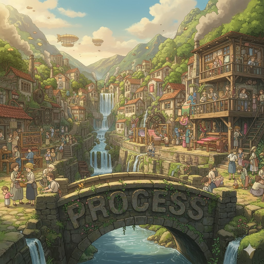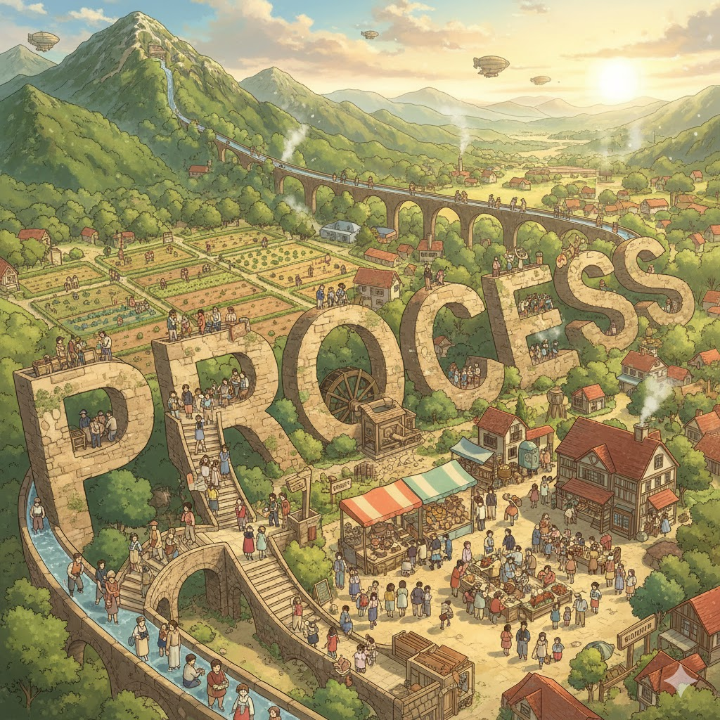 이 표현들은 과정의 '산업적 생산', '자연적 발생', '행정적 승인', '체계적 분석'이라는 다양한 측면을 나타냅니다.