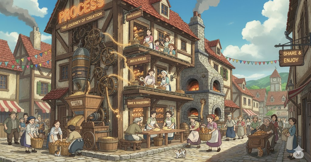 '원자재'(raw material)를 '기계'(machine), '도구'(instrument), 또는 '노동'(labor)을 '사용'(use)하여 '완제품'(finished goods)으로 '변환'(conversion)시키는 '일련'(series)의 '체계적'(systematic)인 '단계'(steps)를 의미합니다. '품질'(quality) '통제'(control)와 '생산'(production) '효율성'(efficiency) 확보에 초점이 맞춰집니다.