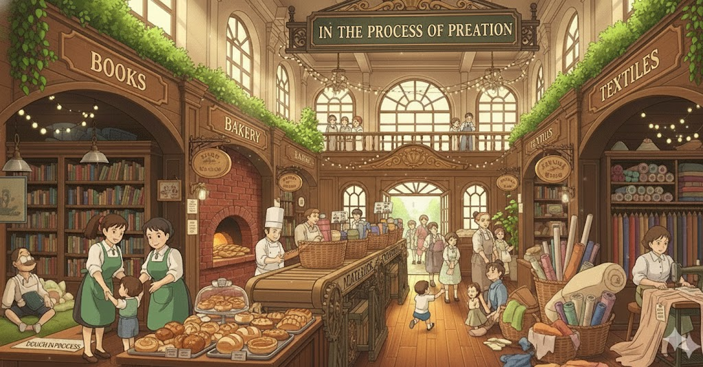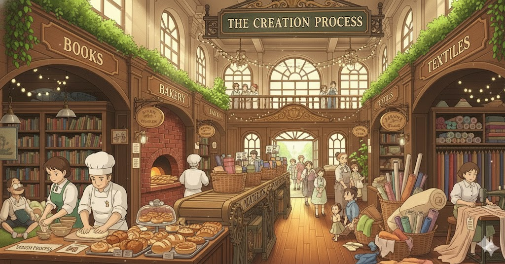 '작가'(writer), '예술가'(artist), '엔지니어'(engineer), 또는 '디자이너'가 '새로운'(new) '아이디어'(idea), '작품'(work), 또는 '해결책'(solution)을 '발상'(think up)하고 '발전'(development)시켜 '현실'(reality)로 '만들어내는'(create) '일련'(series)의 '정신적'(mental) 및 '실행적'(execution) '단계'(steps)를 의미합니다. '혁신'(innovation)과 '창의적'(creative) '열정'(passion)을 강조합니다.