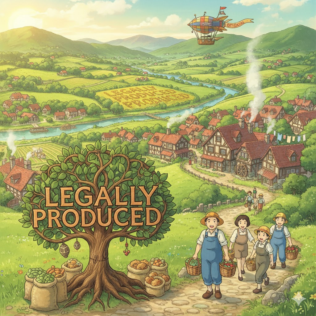 - 해석: 국가나 지역의 법률 및 규정을 준수하여 만들어진 상품이나 결과. (불법 생산과 대비)