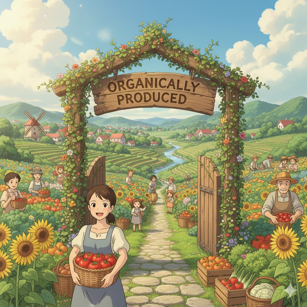 - 해석: 합성 비료나 농약을 사용하지 않고 유기적인 방식으로 재배되거나 만들어진 농산물. (환경, 보건 지문에서 중요)