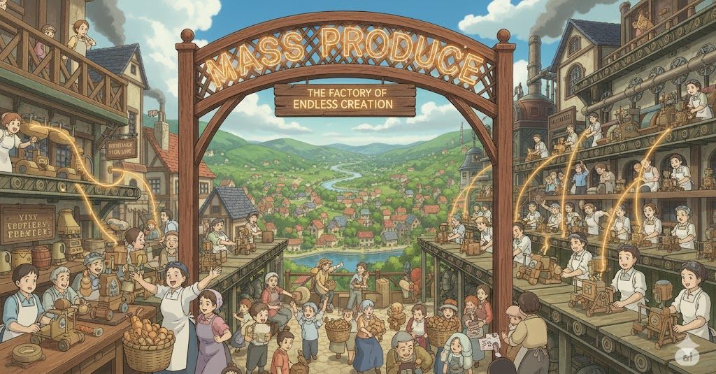 '특정'(specific) '상품'(product)을 '표준화'(standardized)된 '공정'(process)과 '기계'(machine)를 '사용'(use)하여 '매우'(very) '많은'(large amount) '양'(quantity)으로 '빠르게'(quickly) '생산'(produce)하는 행위를 의미합니다. '비용'(cost) '절감'(reduction)과 '시장'(market) '수요'(demand) 충족을 강조합니다.