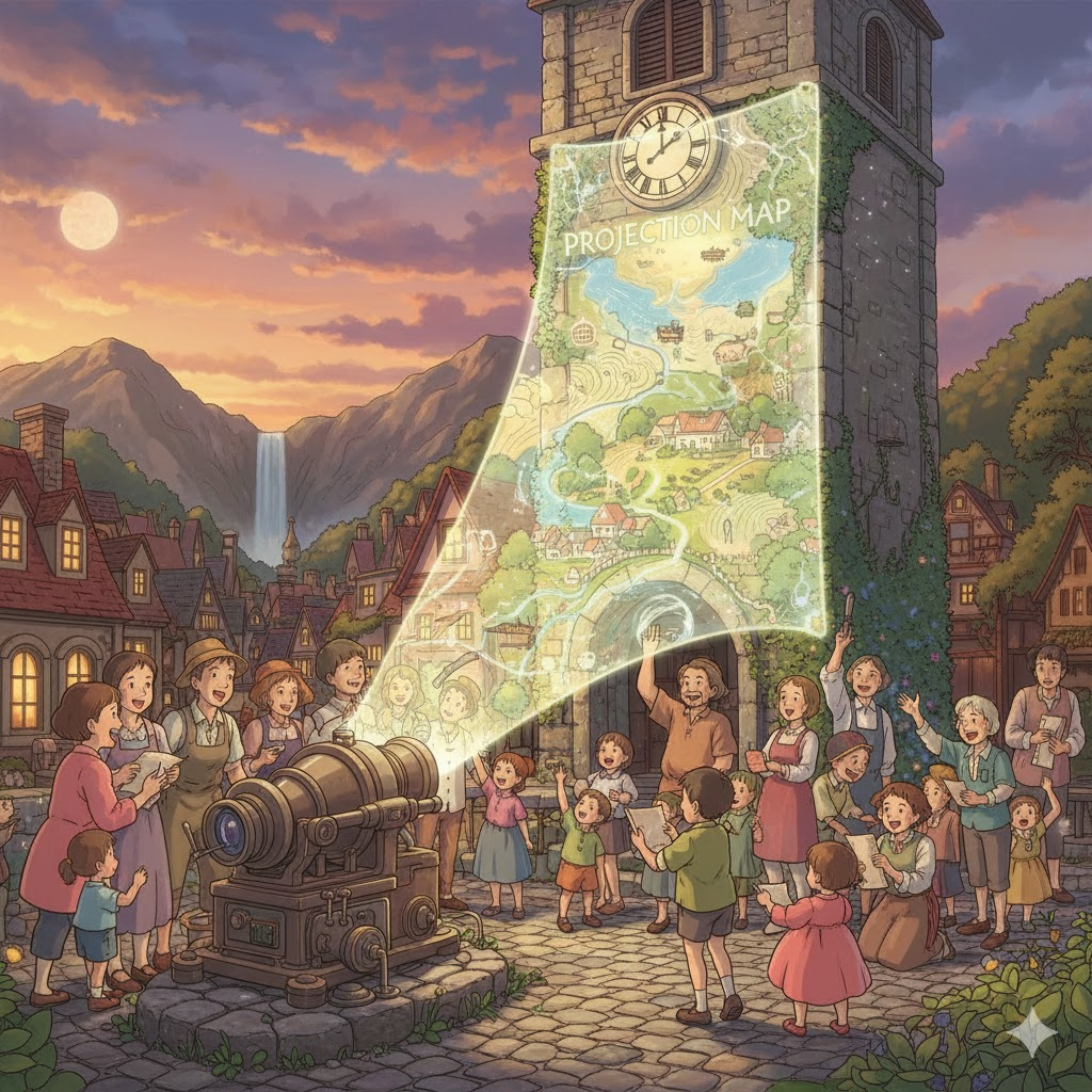 (명사) 투영 지도 (지구 표면을 평면에 표현)