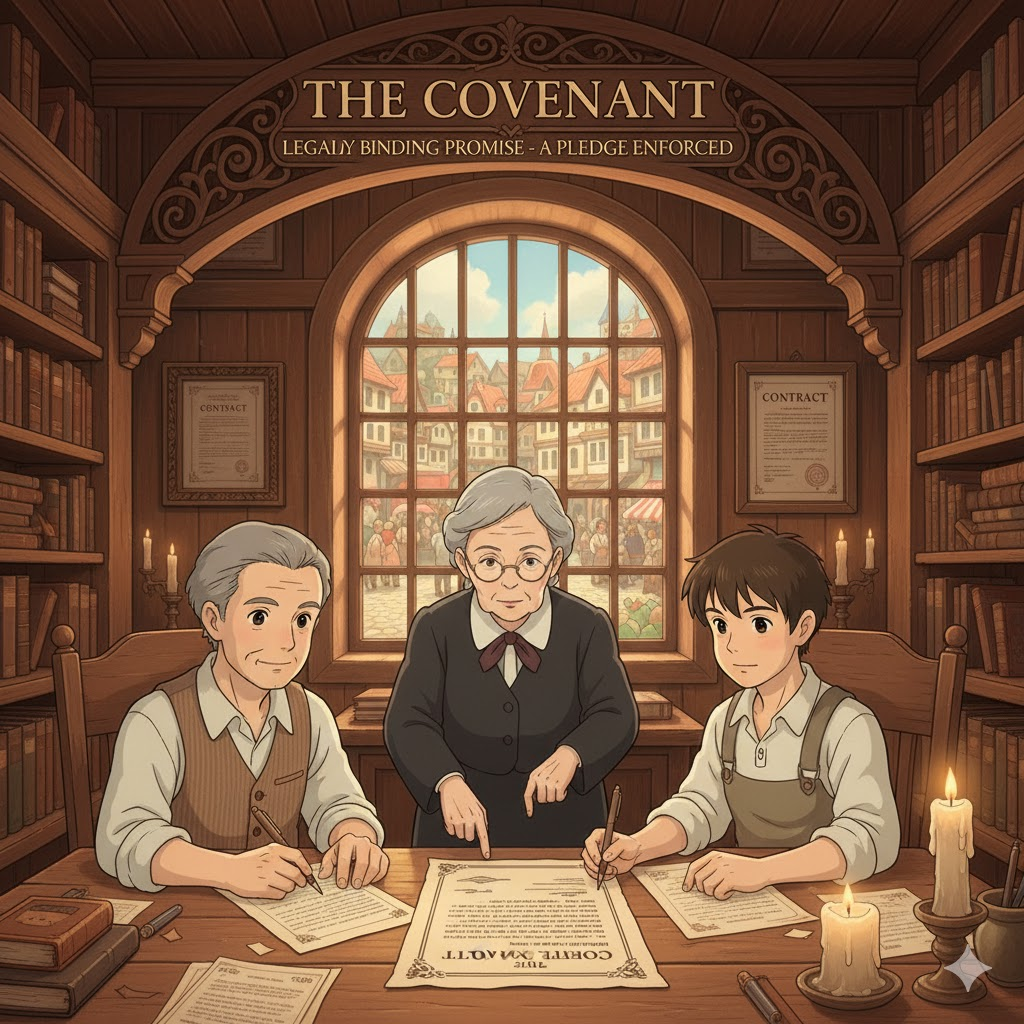 '법원'(court)이나 '법률'(law)에 '의해'(by) '강제'(enforce)될 '수' 있으며, '위반'(violation) 시 '법적'(legal) '결과'(consequence)나 '처벌'(penalty)을 '초래'(cause)하는 '공식적인'(official) '약속'(promise)을 의미합니다. '계약'(contract)이나 '합의'(agreement)의 '형태'(form)를 가집니다.