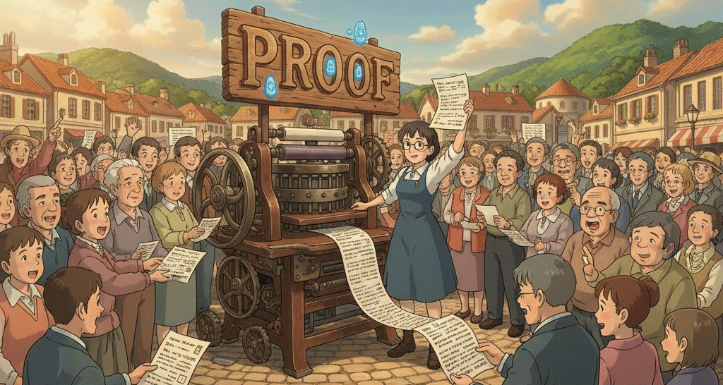 | 라틴어 probare (시험하다) → 고대 프랑스어 preuve | "시험을 통해 확인된 것" | 사실의 증거/입증 → 수학적 증명 → 인쇄물의 교정쇄 |