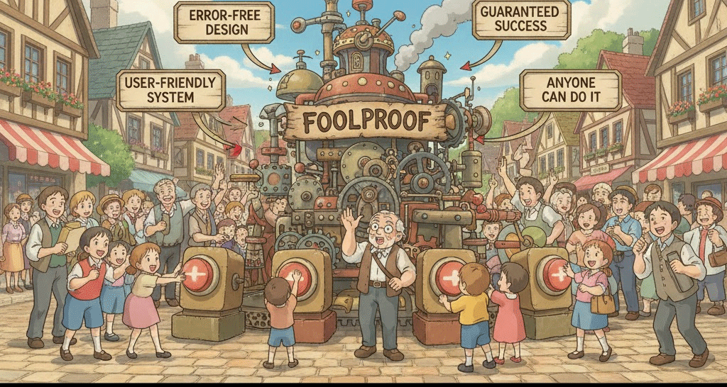 - 해석: 오류, 실수, 또는 잘못된 사용에도 작동이 보장되는 설계나 계획. (매우 단순하고 확실함을 강조)