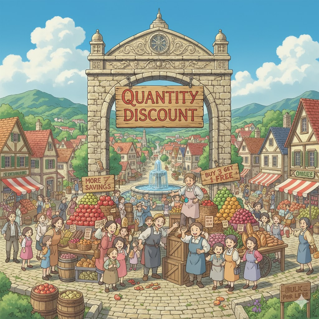 - quantity discount는 기업이 규모의 경제(economies of scale)를 통해 비용을 절감하고 경쟁 우위를 확보하는 전략을 보여줍니다. 지문은 대량 구매가 소비자에게는 비용 절감을, 기업에게는 재고 회전율 증가를 가져오는 이점을 논합니다.