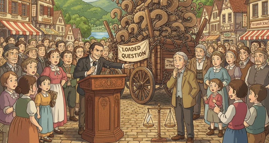 - 해석: 특정 전제나 가정을 내포하고 있어, 어떤 대답을 해도 부정적인 의미를 가질 수 있는 질문. (예: "여전히 아내를 때리십니까?")