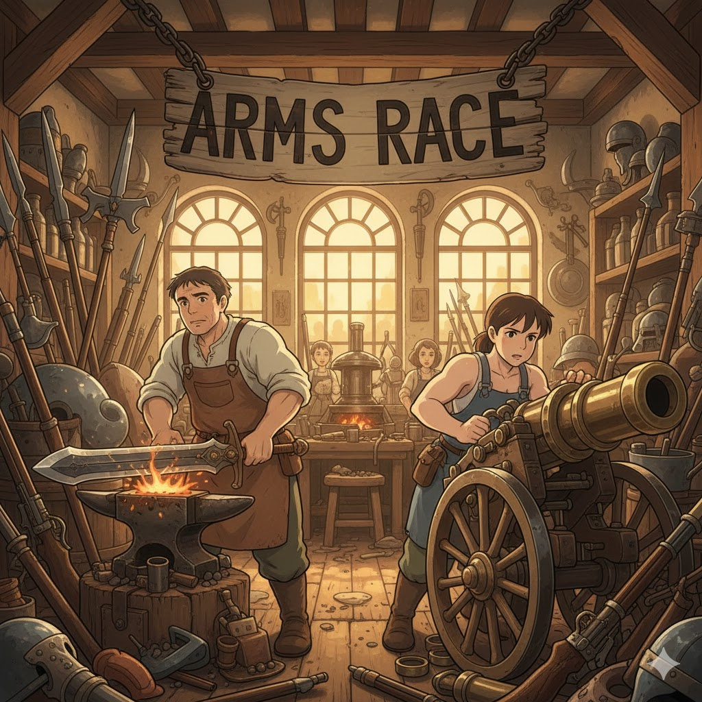 - 해석: 국가들이 서로를 능가하는 군사력 (무기, 기술)을 확보하기 위해 지속적으로 경쟁하는 상태.
