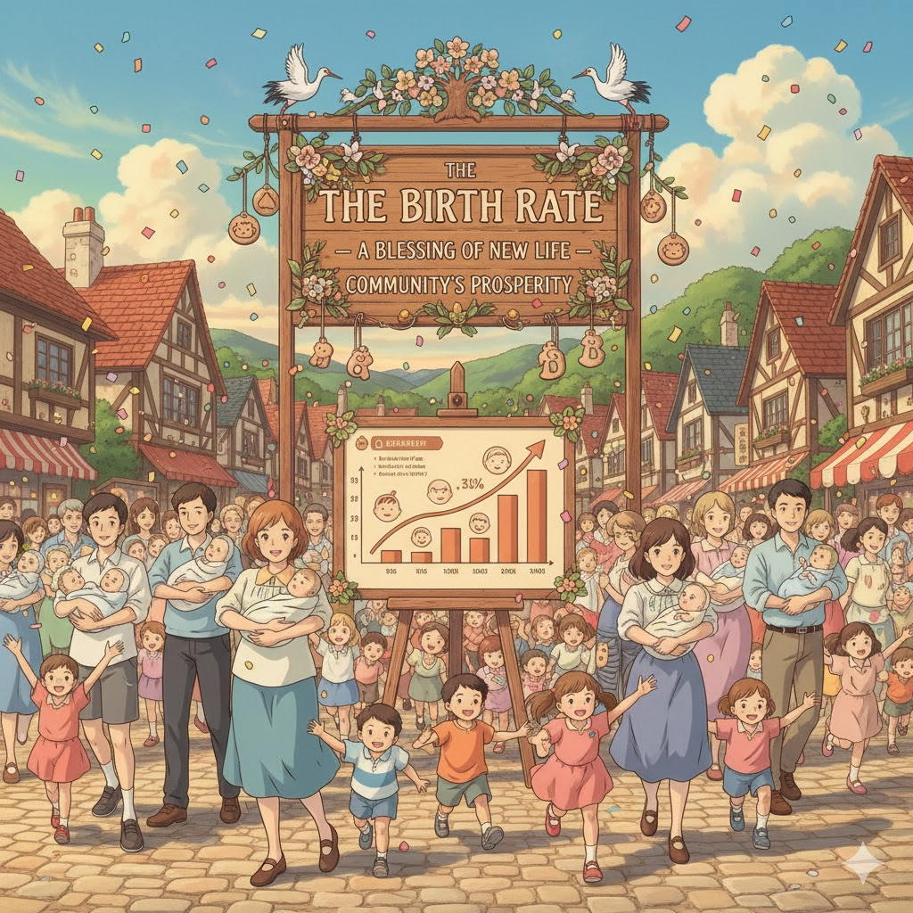 '특정'(specific) '지역'(area)이나 '국가'(nation)에서 '1년'(year) 동안 '총'(total) '인구'(population) 대비 '출생'(birth)한 '아기'(babies)의 '수'(number)를 '측정'(measure)하는 '지표'(indicator)를 의미합니다. '인구'(population) '증가'(growth)나 '감소'(decline)를 '결정'(determine)하는 '핵심'(core) '요소'(element)입니다.