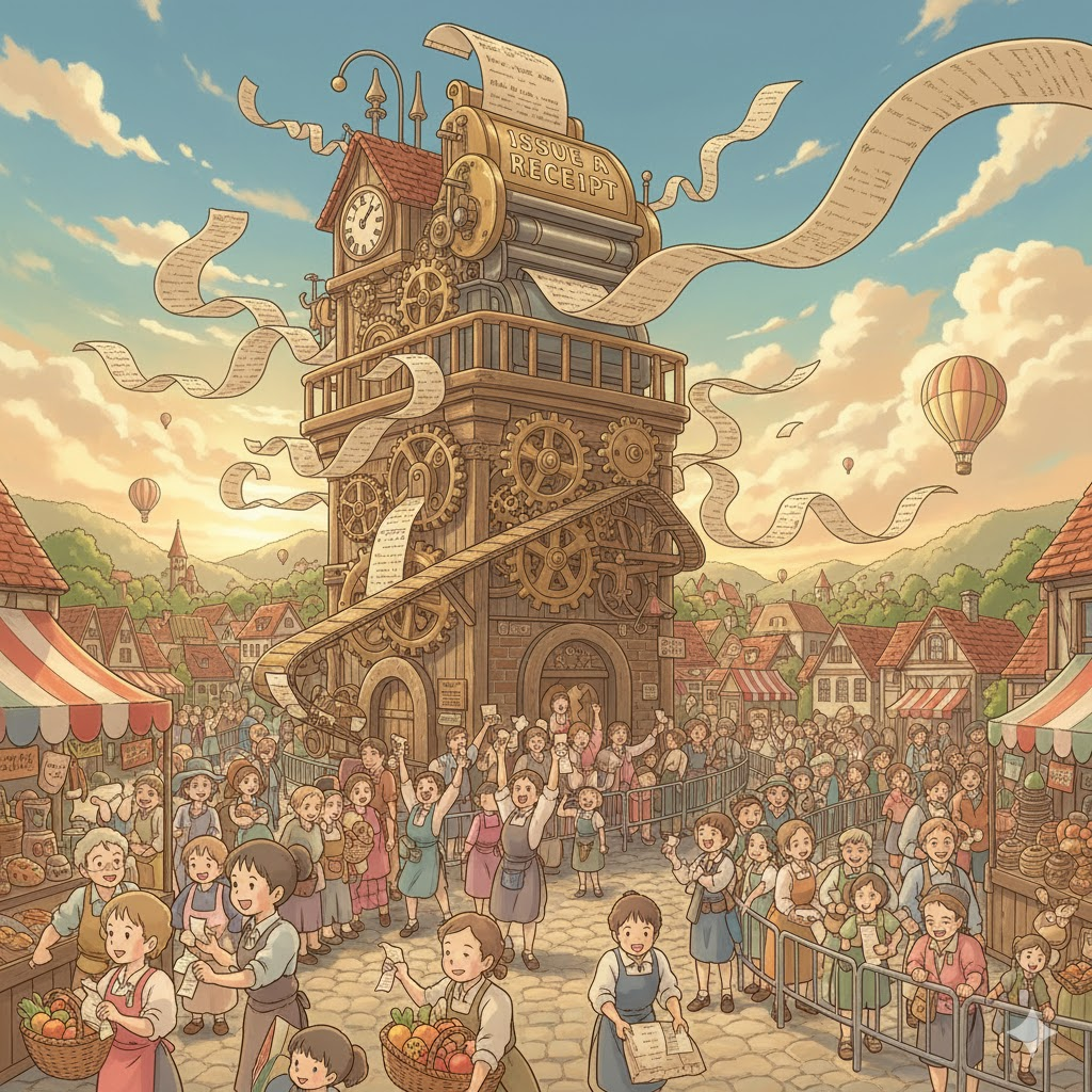 - 해석: 거래나 지불 후에 영수증을 만들어 고객에게 교부하는 행위.