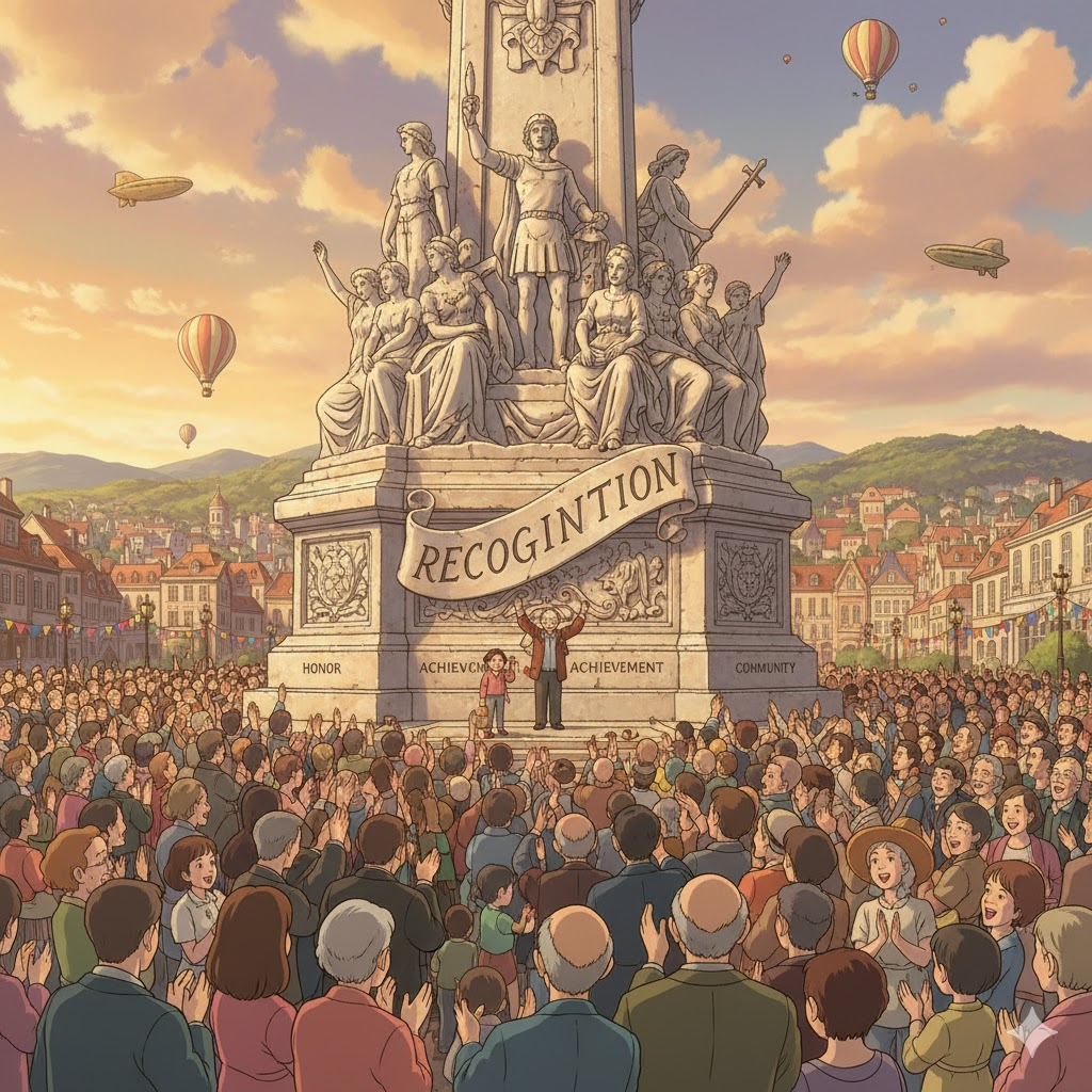 '개인'(individual), '조직'(organization), 또는 '아이디어'(idea)가 '노력'(effort)이나 '성과'(achievement)를 '통해', '다른' 사람들(people)이나 '전문'(expert) '집단'(group)으로부터 '지지'(support)와 '공식적'(official)인 '인정'(recognition)을 '획득'(gain)하는 행위를 의미합니다. '성공'(success)과 '명예'(honor)를 '추구'(pursuit)하는 것을 강조합니다.