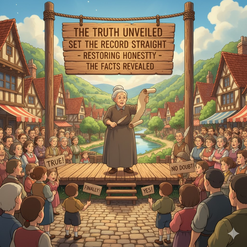 '잘못'(mistake)되거나 '퍼진'(spread) '오해'(misunderstanding), '거짓'(lie) '정보'(information), 또는 '오보'(false report)에 대해 '진실'(truth)을 '밝히고'(shine a light on) '정확한'(accurate) '사실'(fact)을 '공개적'(publicly)으로 '확립'(establish)하는 행위를 의미합니다. '투명성'(transparency) 확보와 '평판'(reputation) '회복'(repair)을 목적으로 합니다.
