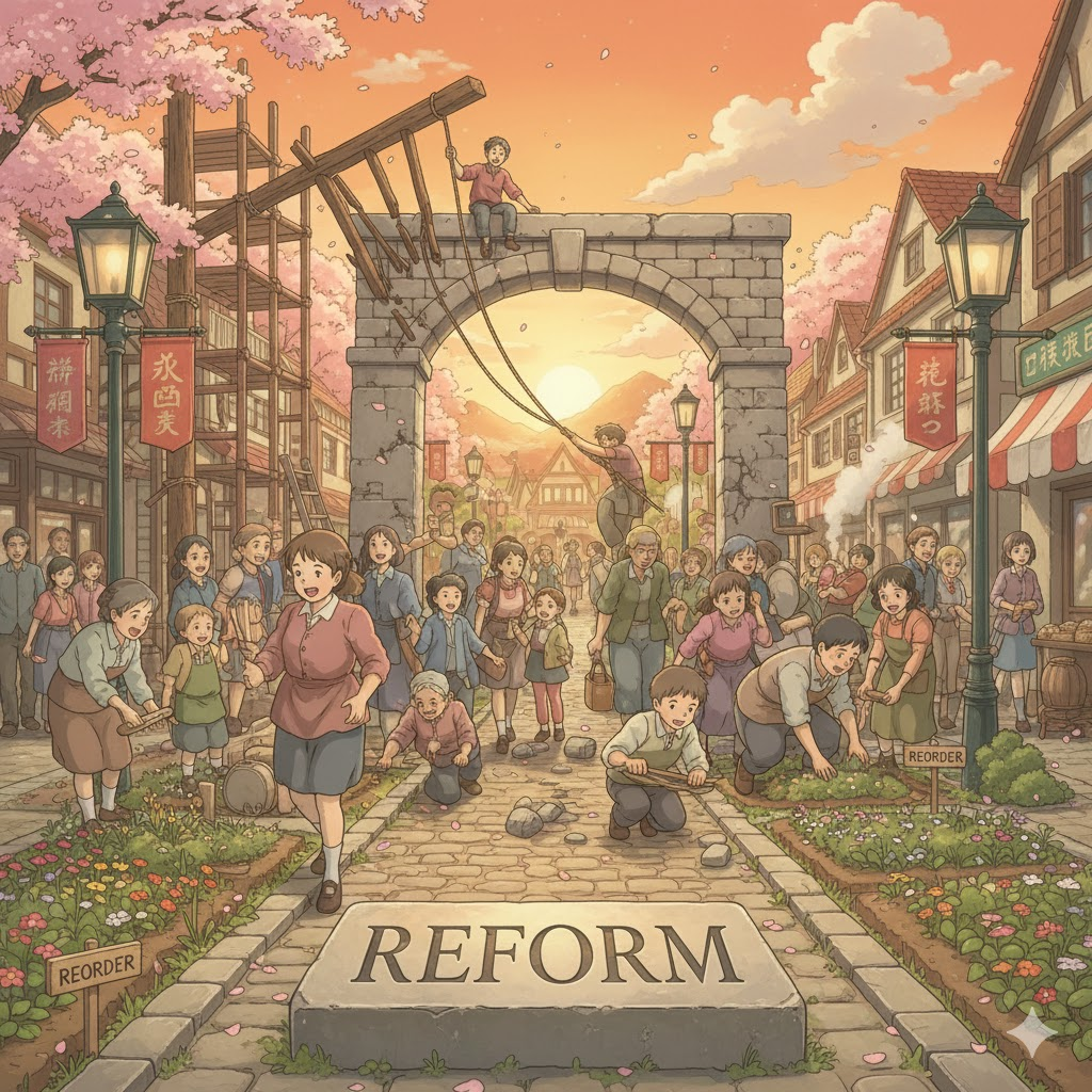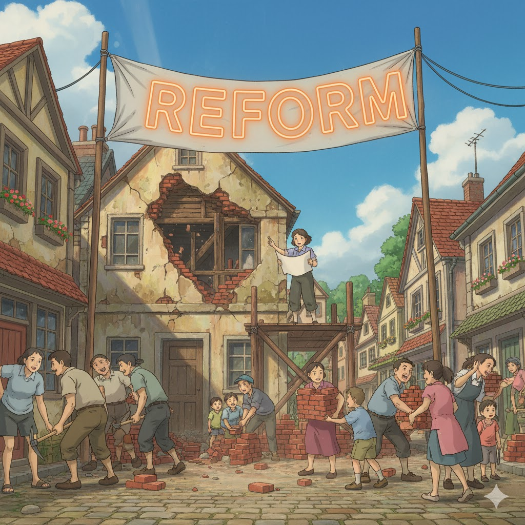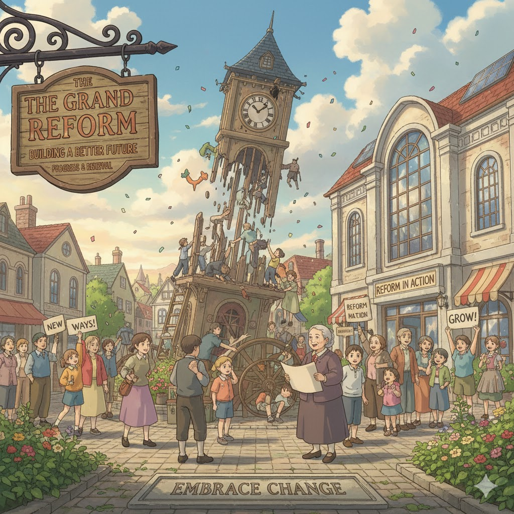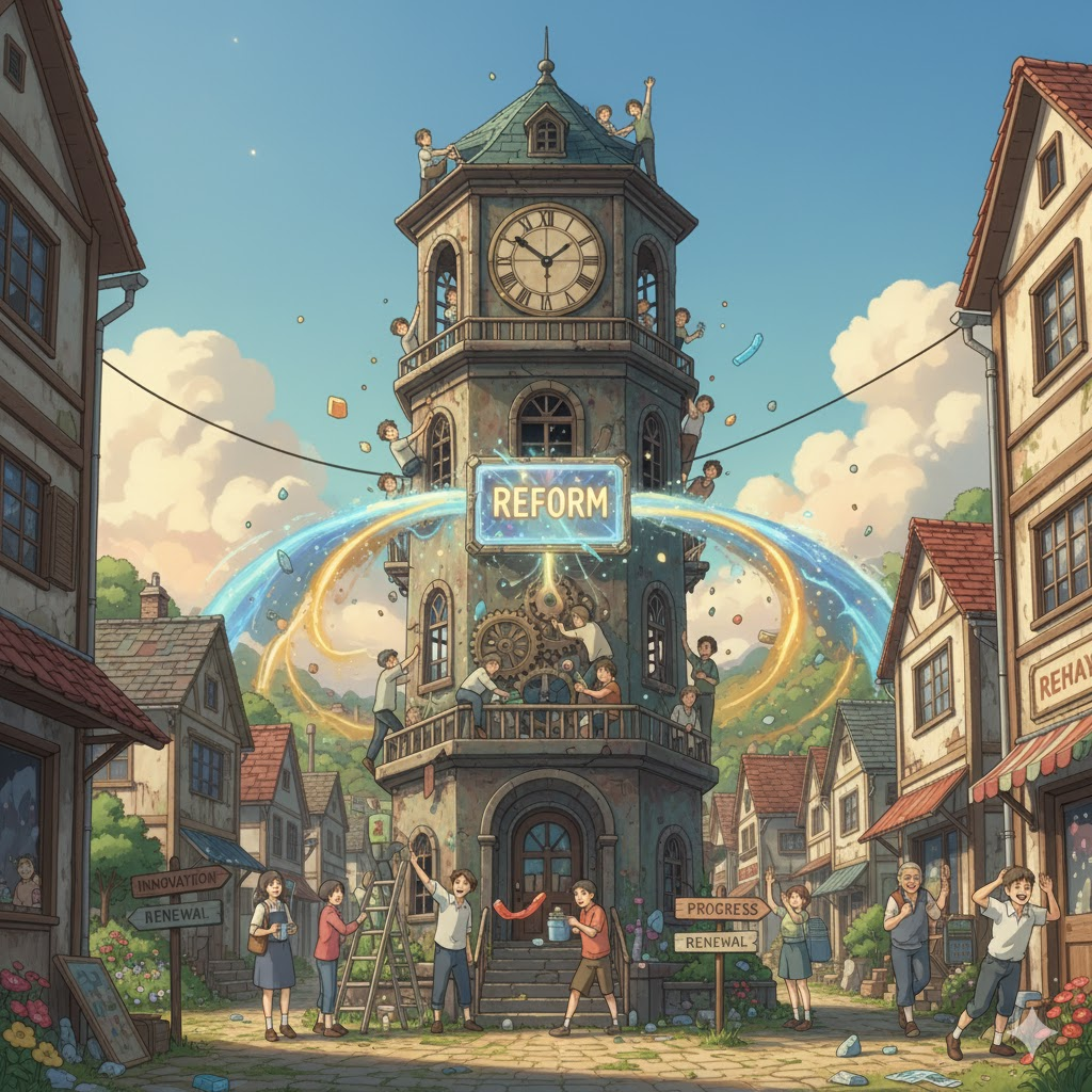 개혁, 개선. 제도, 구조, 관행 등 문제점을 바로잡기 위한 의도적이고 근본적인 변화.
