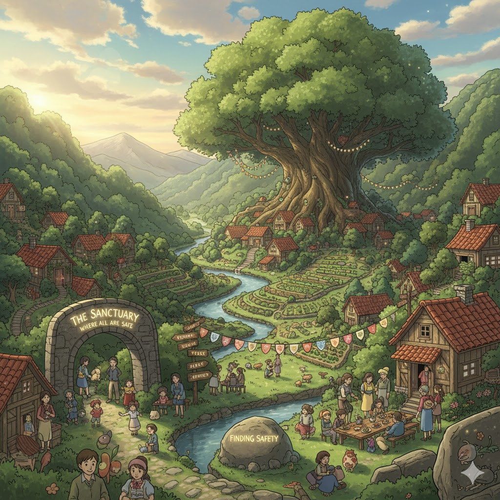 '위협'(threat), '폭력'(violence), 또는 '박해'(persecution)가 '없는'(absence) '보장된'(guaranteed) '안전'(safe)이 '확보'(secured)된 '장소'(place)나 '상태'(refuge)를 의미합니다. '보호'(protection)와 '위로'(comfort)를 '제공'(provide)하는 '신뢰할'(reliable) 수 있는 '안식처'(sanctuary)를 강조합니다.