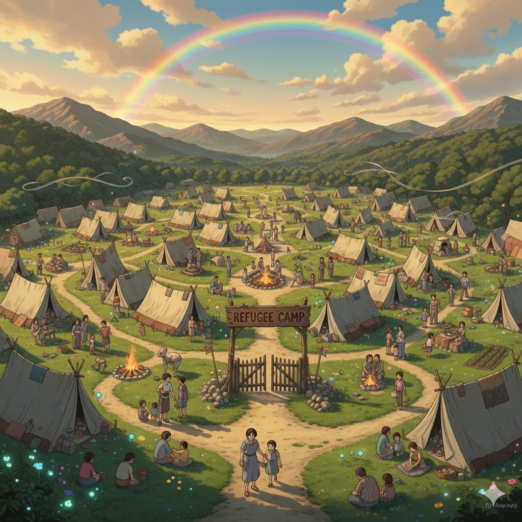 - 해석: 전쟁, 박해, 또는 재난으로 인해 집을 떠나 피난 온 사람들을 위해 임시 거처를 제공하는 시설.