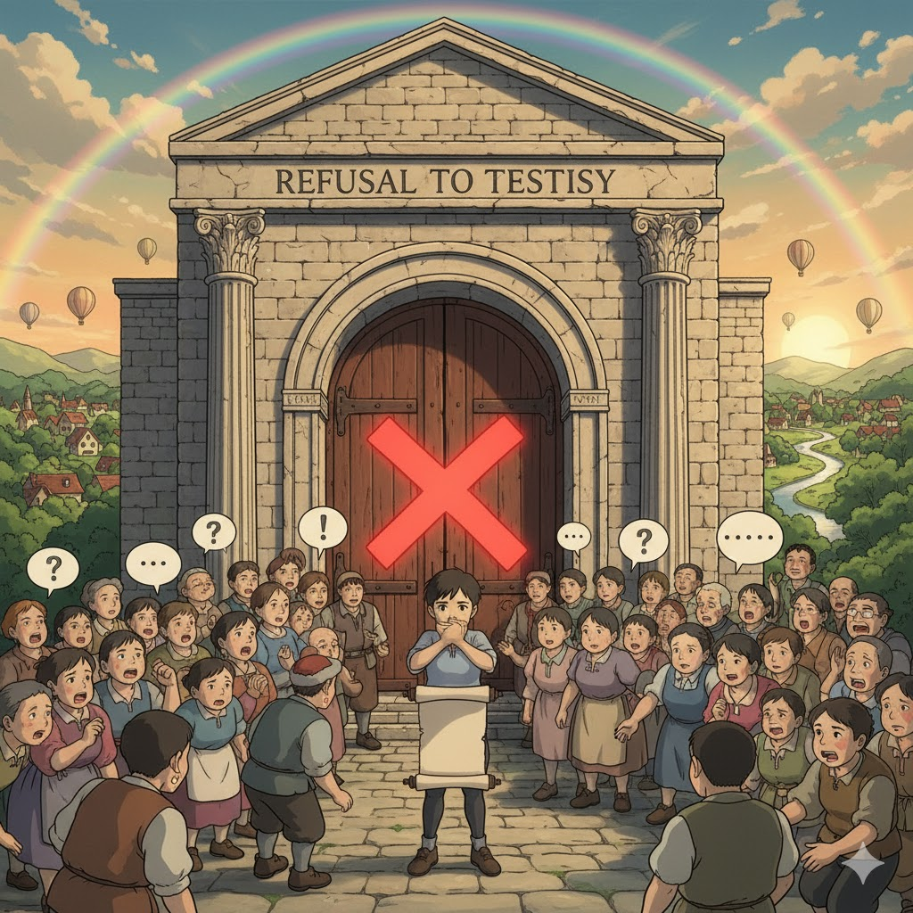 '법정'(court)이나 '공식적인'(official) '조사'(investigation)에서 '증인'(witness)이 '법적'(legal)으로 '요구'(require)되는 '증언'(testimony)을 '제공'(provide)하는 것을 '거부'(refusal)하는 행위를 의미합니다. '묵비권'(right to silence)을 행사하거나, '불복종'(non-compliance)을 나타내는 '법적'(legal) '상황'(situation)을 강조합니다.
