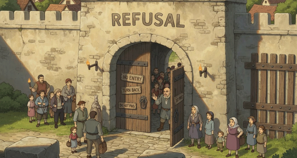 | fundere (라틴어: fundere와 유사) | '쏟다', '붓다' | (어원적 연결은 불명확하나) 요청을 받아들이지 않고 내보내는 행위. | 거부 (Denial) |