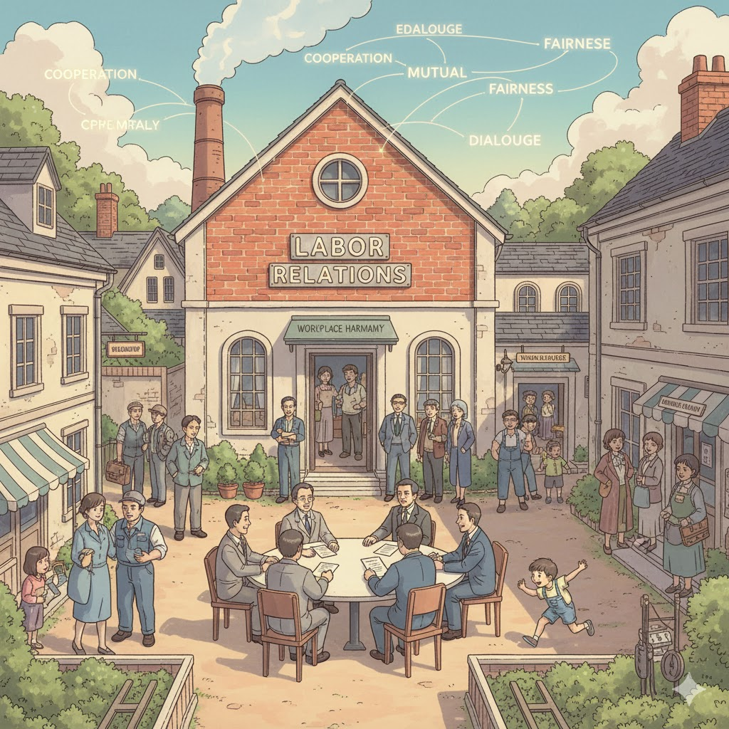 '고용주'(employer) 또는 '경영진'(management)과 '노동자'(labor) 또는 '노동조합'(union) '간'(between)의 '협상'(negotiation), '계약'(contract), '갈등'(conflict), 그리고 '조화'(harmony) '상태'(state)를 의미합니다. '임금'(wages), '근무'(work) '조건'(conditions), 그리고 '직원'(employee) '권리'(rights)의 '문제'(issue)에 초점이 맞춰집니다.