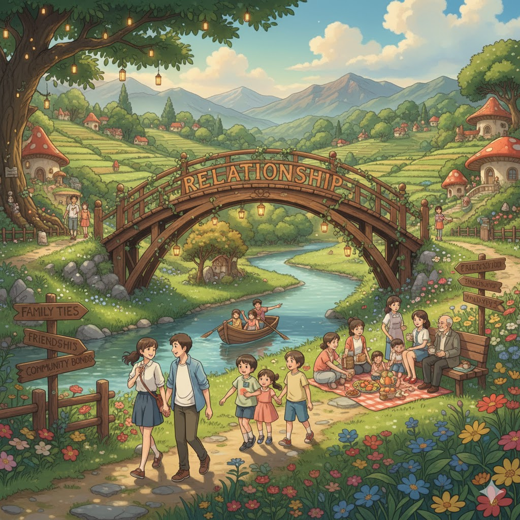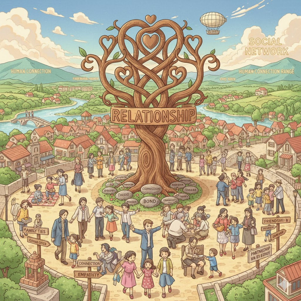 '둘'(two) 이상의 '사람'(person)이 '서로'(each other) '상호작용'(interaction)하고 '감정적'(emotional) 또는 '사회적'(social) '유대'(bond)를 '형성'(form)하는 '관계'(relationship)를 의미합니다. '직장'(workplace), '학교'(school), 또는 '친구'(friend) '사이'의 '소통'(communication)과 '갈등'(conflict) '해결'(solve)에 초점이 맞춰집니다.