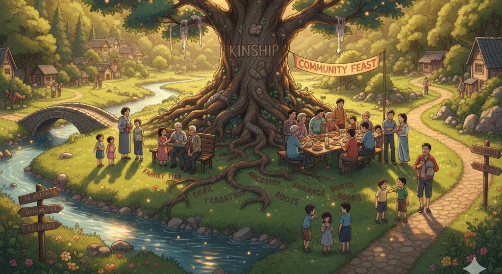 '혈연'(blood), '결혼'(marriage), 또는 '입양'(adoption)을 '통해' '맺어진'(form) '가족'(family)이나 '친척'(relative) 사이의 '연관성'(relation)을 의미합니다. '사회적'(social) '구조'(structure), '상속'(inheritance), 또는 '문화적'(cultural) '전통'(tradition) '연구'(study)에 초점이 맞춰집니다.