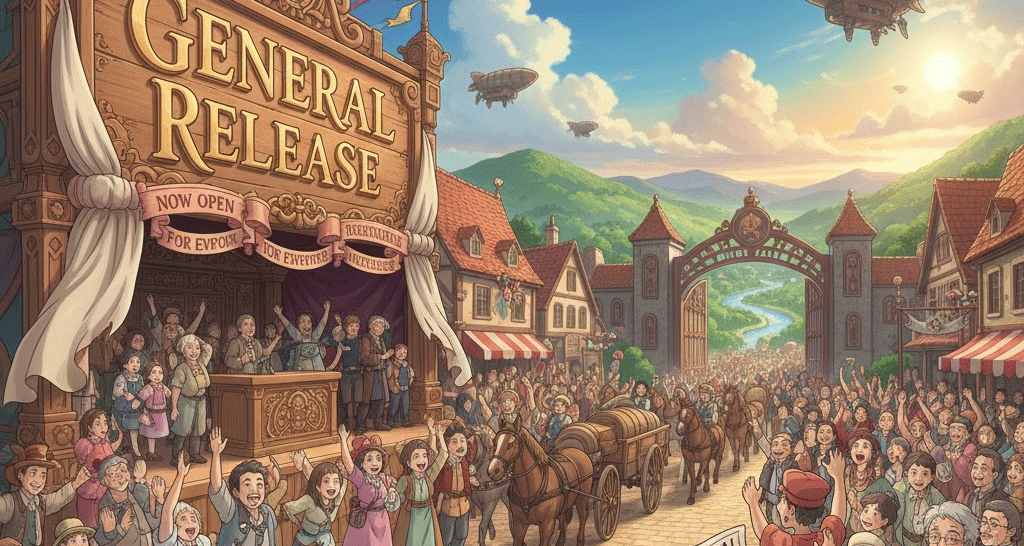 - 해석: 영화 등이 제한된 상영을 마치고 모든 상영관이나 대중 시장에 동시에 공개되는 상태.