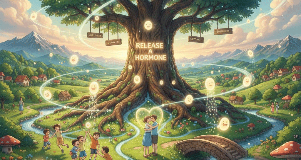'생물'(biological) '체계'(system) (예: 뇌, 내분비선)에서 '특정'(specific) '물질'(hormone)이 '생산'(produce)되어 '혈류'(bloodstream)로 '방출'(discharge)되는 '현상'(phenomenon)을 의미합니다. '스트레스'(stress)나 '기분'(mood) '조절'(regulation)과 같은 '신체적'(physical) 또는 '심리적'(psychological) '반응'(response)에 초점이 맞춰집니다.