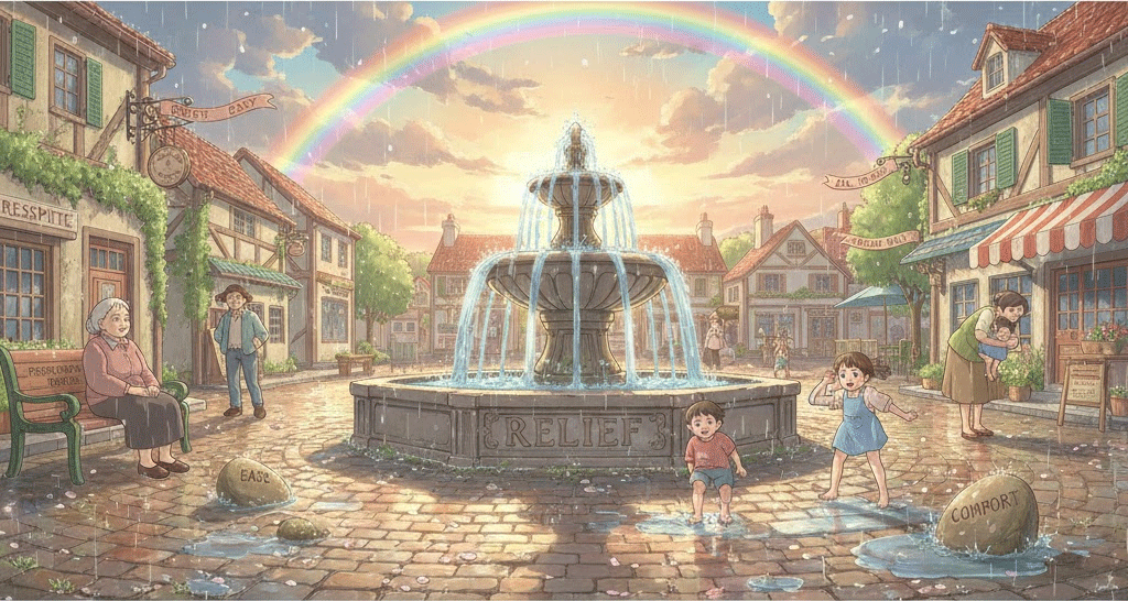 안도, 구호, 경감. 고통이나 부담이 줄어드는 감정적/물리적 상태, 그리고 구체적인 지원 활동.