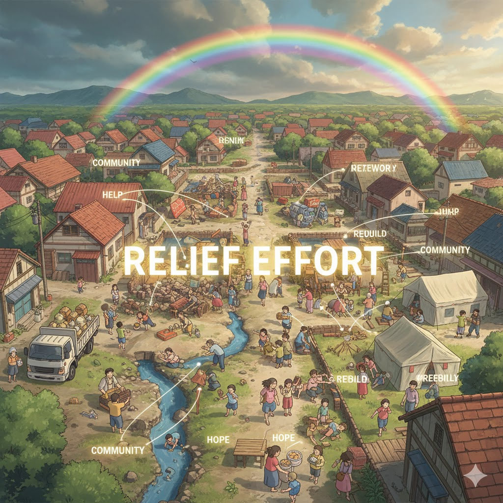 - 해석: 재난이나 위기 상황에서 피해자들을 돕기 위한 조직적인 노력과 활동.