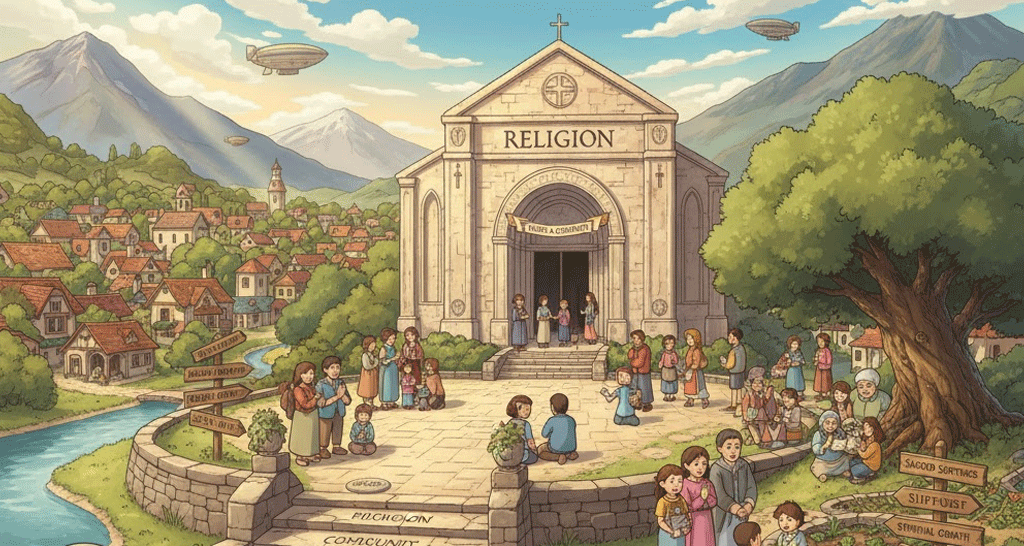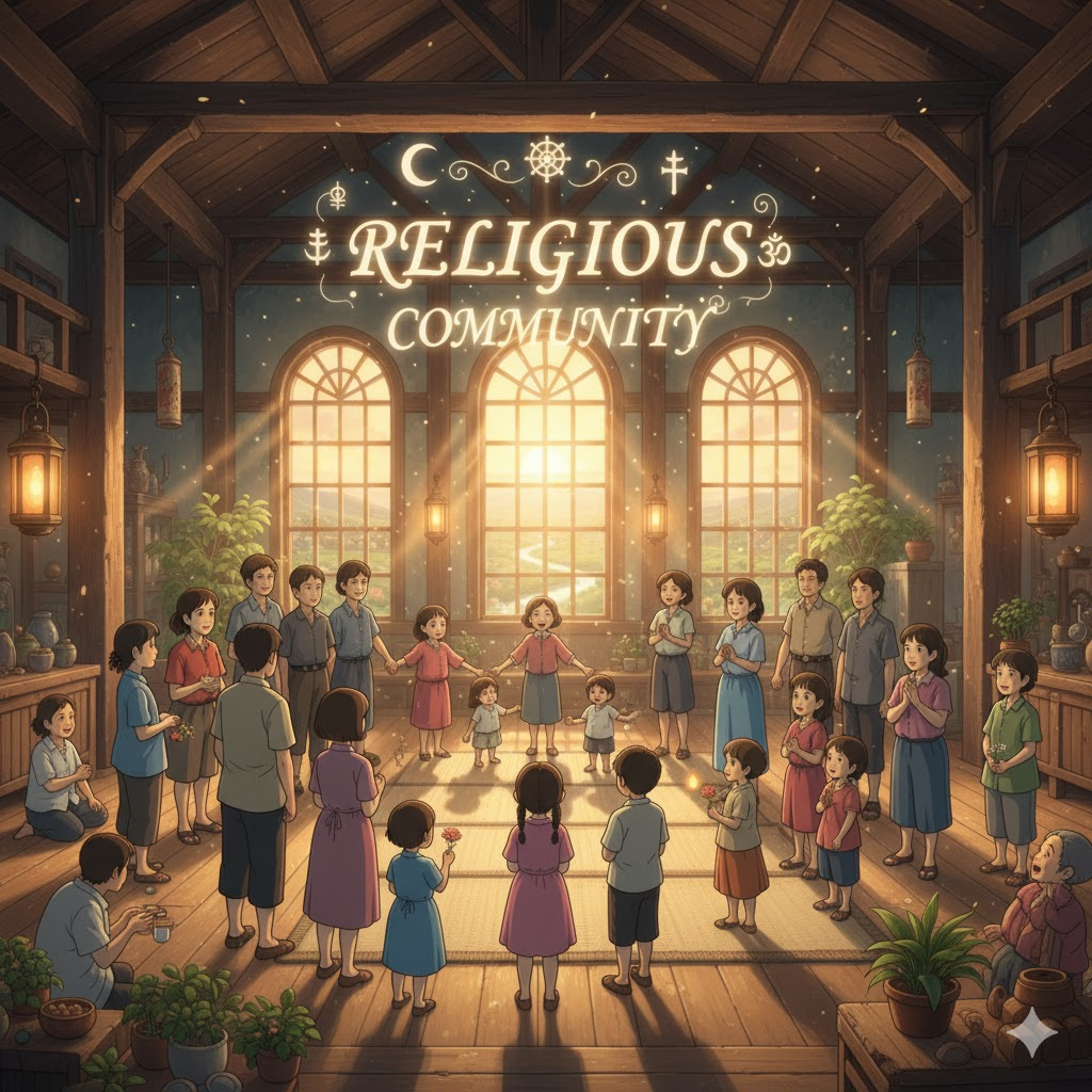 - 해석: 같은 종교를 믿는 사람들이 함께 모여 의례를 수행하고 사회적 유대감을 나누는 집단.