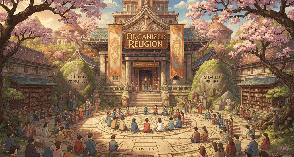 - 해석: 공식적인 교리, 성직자 계층, 건물, 그리고 체계적인 의례를 갖춘 종교. (개인의 영성과 대비)