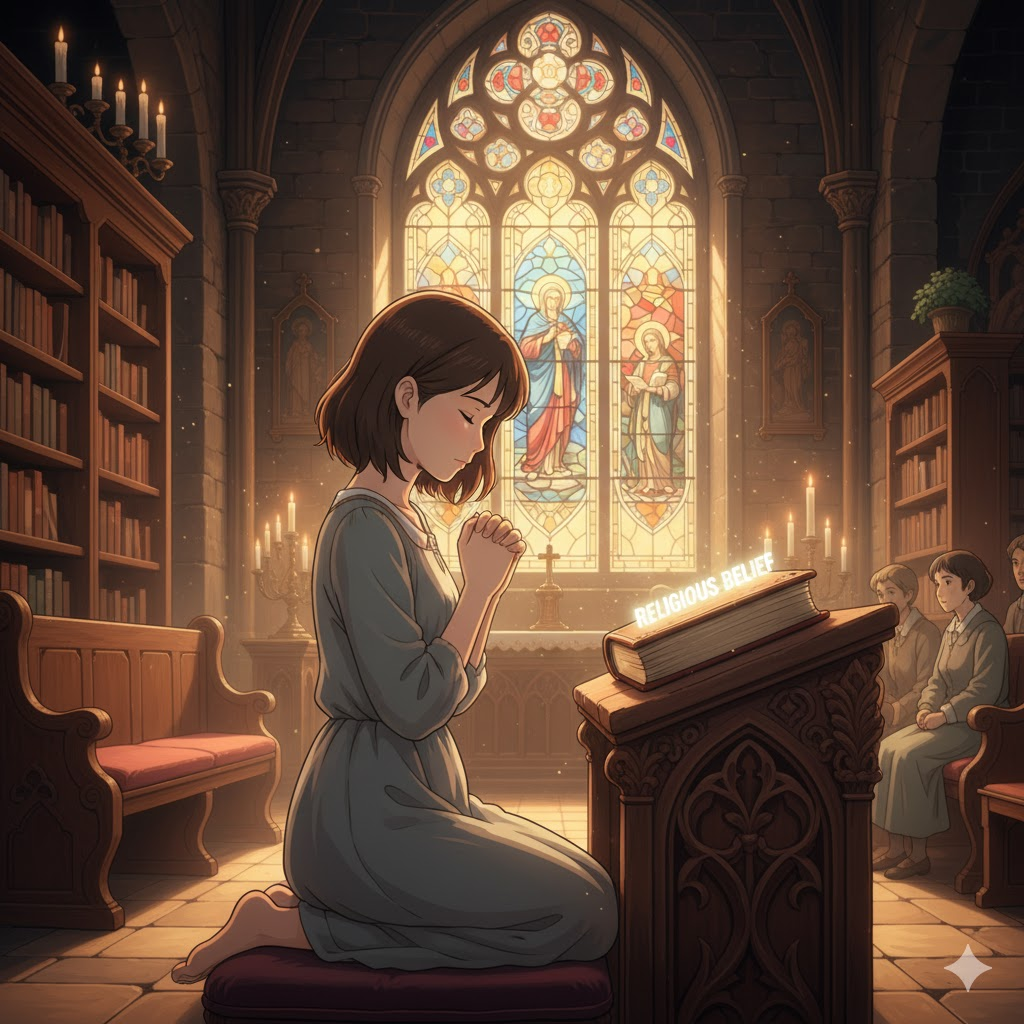 '신'(God)의 '존재'(existence), '삶'(life)의 '사후'(afterlife), 또는 '신성한'(sacred) '교리'(doctrine)와 같은 '종교'(religion)의 '핵심'(core) '가르침'(teaching)을 '사실'(fact)로 '받아들이고'(accept) '따르는'(follow) '개인의'(personal) '확신'(conviction)을 의미합니다. '행동'(behavior)과 '도덕적'(moral) '가치'(value)의 '근거'(basis)가 됩니다.
