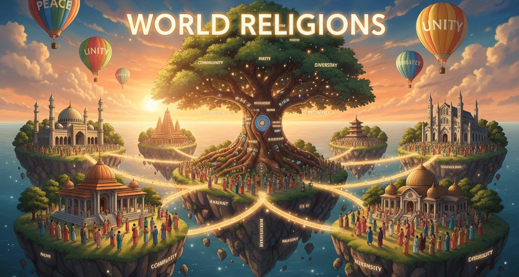 '세계'(world) '인구'(population)의 '상당한'(significant) '부분'(part)이 '따르거나'(follow) '영향'(influence)을 '미치는'(impact) '주요'(major) '종교'(religion) (예: 기독교, 이슬람교, 불교)들을 '집합적'(collective)으로 '총칭'(refer)하는 용어입니다. '문화적'(cultural) '다양성'(diversity)과 '역사적'(historical) '영향'(impact)을 강조합니다.