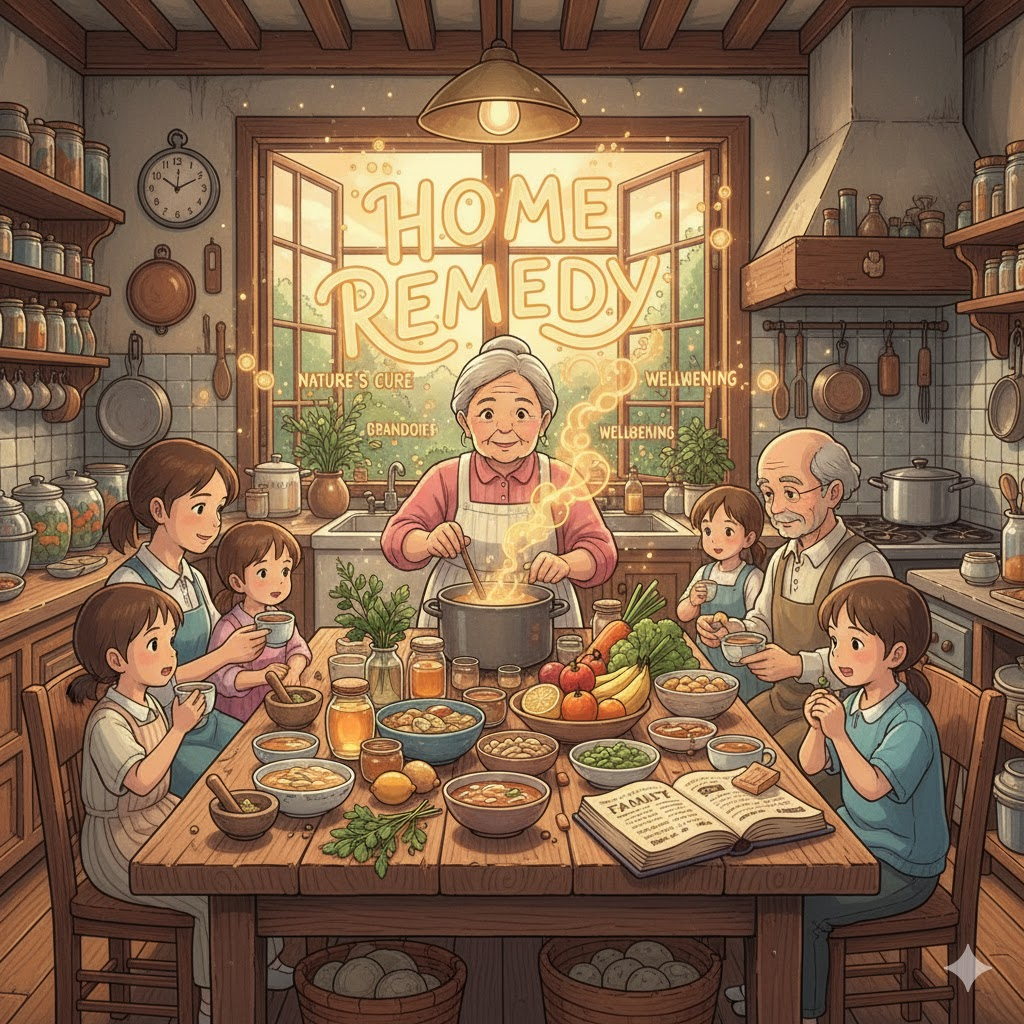 '전문적인'(professional) '의료'(medical) '치료'(treatment) '없이'(without), '집'(home)에서 '흔히'(commonly) '사용'(use)되는 '식품'(food), '약초'(herbs), 또는 '간단한'(simple) '방법'(method)을 '사용'(use)하여 '질병'(disease), '통증'(pain), 또는 '불편함'(discomfort)을 '완화'(alleviate)시키는 '민간'(folk) '치료법'을 의미합니다. '비과학적'이지만 '경험적'(empirical)인 '효과'(effect)를 강조합니다.