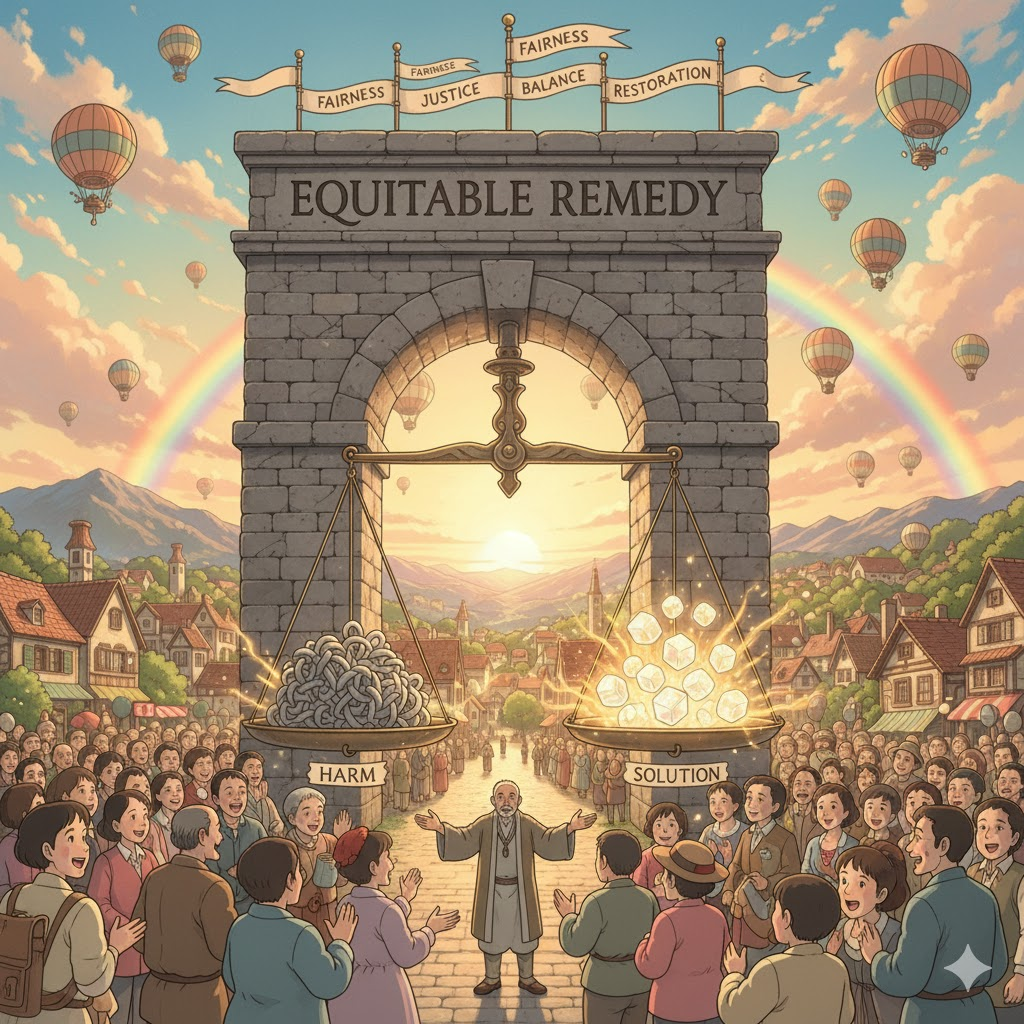 '법률'(law)에 '따라'(by) '손해'(damage) '배상'(compensation)과 같은 '금전적'(monetary) '보상'(remedy)이 '불가능'(impossible)하거나 '부적절'(inappropriate)할 때, '법원'(court)이 '공정'(fair)과 '정의'(justice)를 '바탕'(basis)으로 '제공'(provide)하는 '비금전적'(non-monetary) '해결'(solution) '수단'(means) (예: 특정 이행(specific performance), 금지 명령(injunction))을 의미합니다. '도덕적'(moral) '원칙'(principles)과 '형평성'(equity)을 강조합니다.