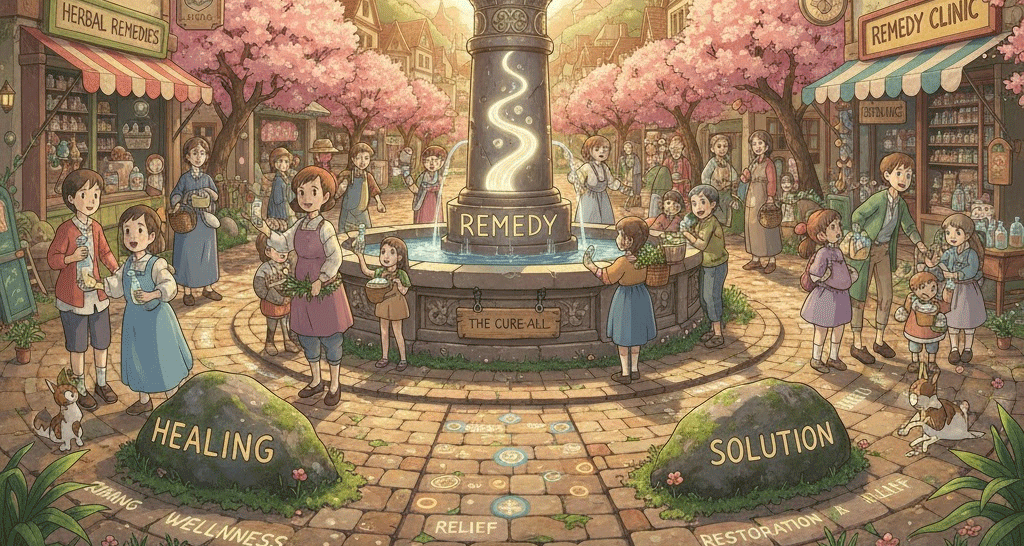 질병, 고통, 문제를 고치거나 해결하는 수단, 치료법; 또는 문제를 해결하다 (명사/동사).