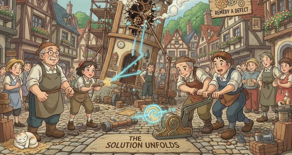 '상품'(product), '시스템'(system), '법률'(law), 또는 '계획'(plan)에 '내재'(inherent)된 '결점'(defect)이나 '오류'(error)를 '찾아내어'(search out), '고치거나'(repair), '수정'(modify)하여 '완전성'(completeness)과 '기능'(function)을 '회복'(recovery)시키는 행위를 의미합니다. '품질'(quality) '보증'(assurance)과 '문제'(problem) '해결'(solve)을 강조합니다.