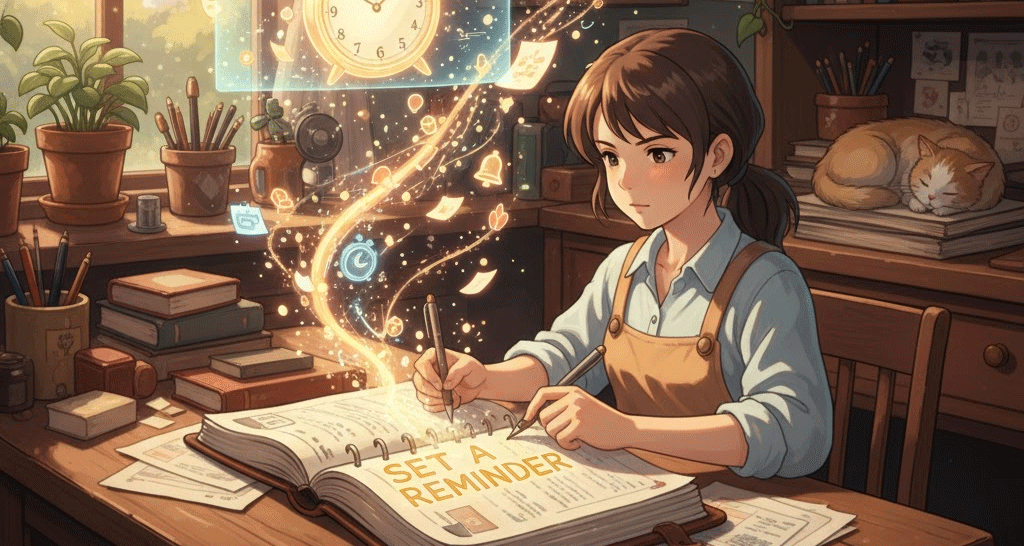- set a reminder는 **인간의 기억 능력(memory)**의 한계를 인정하고, **기술(technology)**을 활용하여 시간 관리와 계획 이행의 효율성을 높이는 현대적인 전략으로 다뤄집니다. 이는 **인지적 부하(cognitive load)**를 줄이는 수단이 됩니다.
