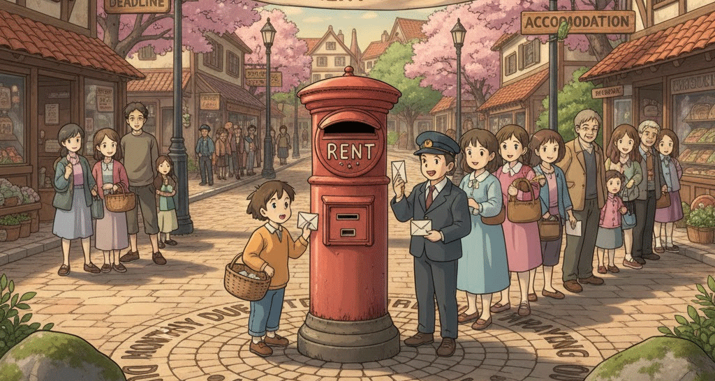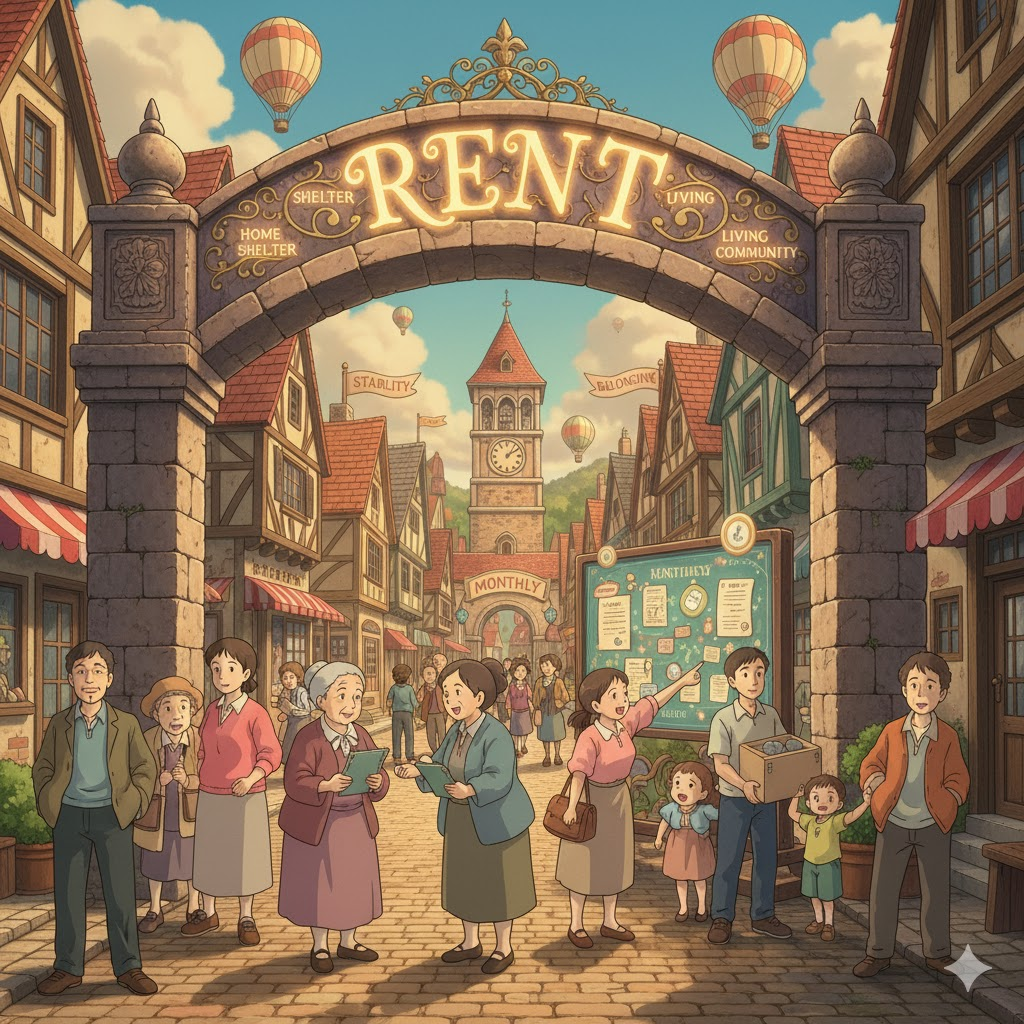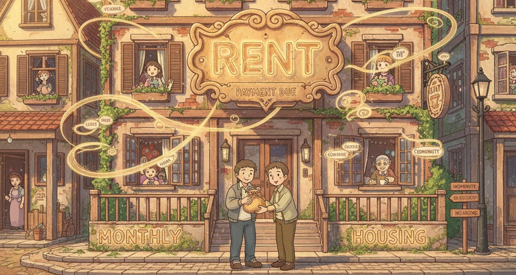 - 해석: 부동산이나 공간을 사용한 대가로 정기적으로 임대료를 내는 행위.