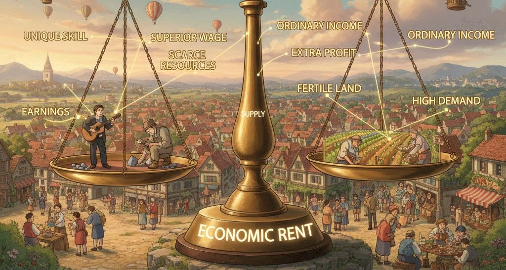 - economic rent는 경제학 지문에서 생산 요소의 희소성과 효율적인 자원 배분 문제를 논하는 핵심입니다. 지문은 이 지대가 순수한 이득($pure gain$)으로서 어떻게 불로소득으로 간주될 수 있는지, 그리고 이것이 경제적 불평등에 미치는 영향을 분석합니다.