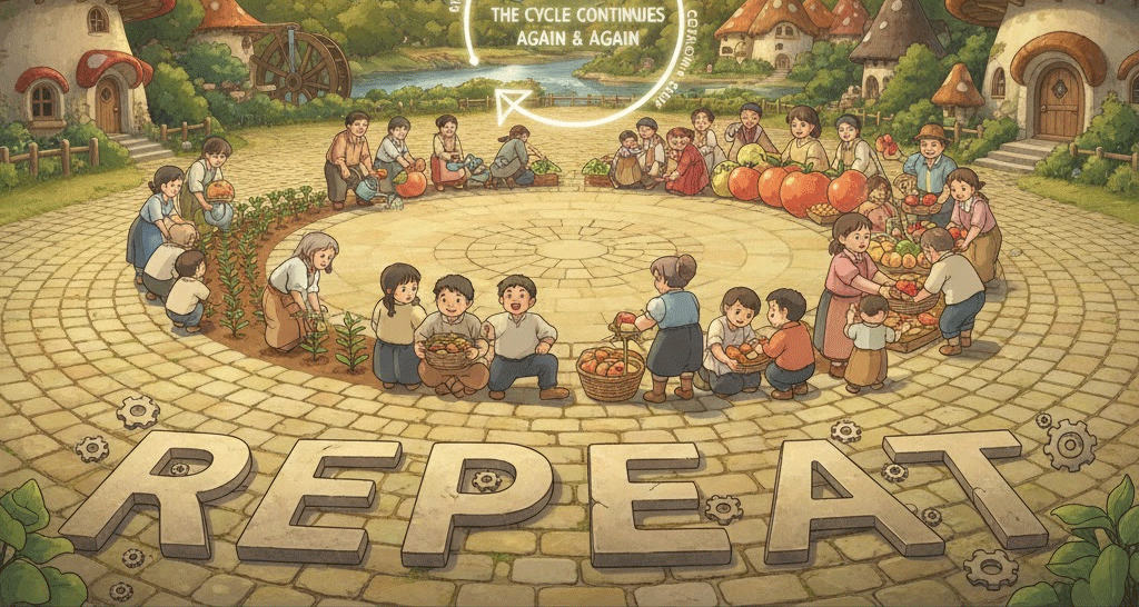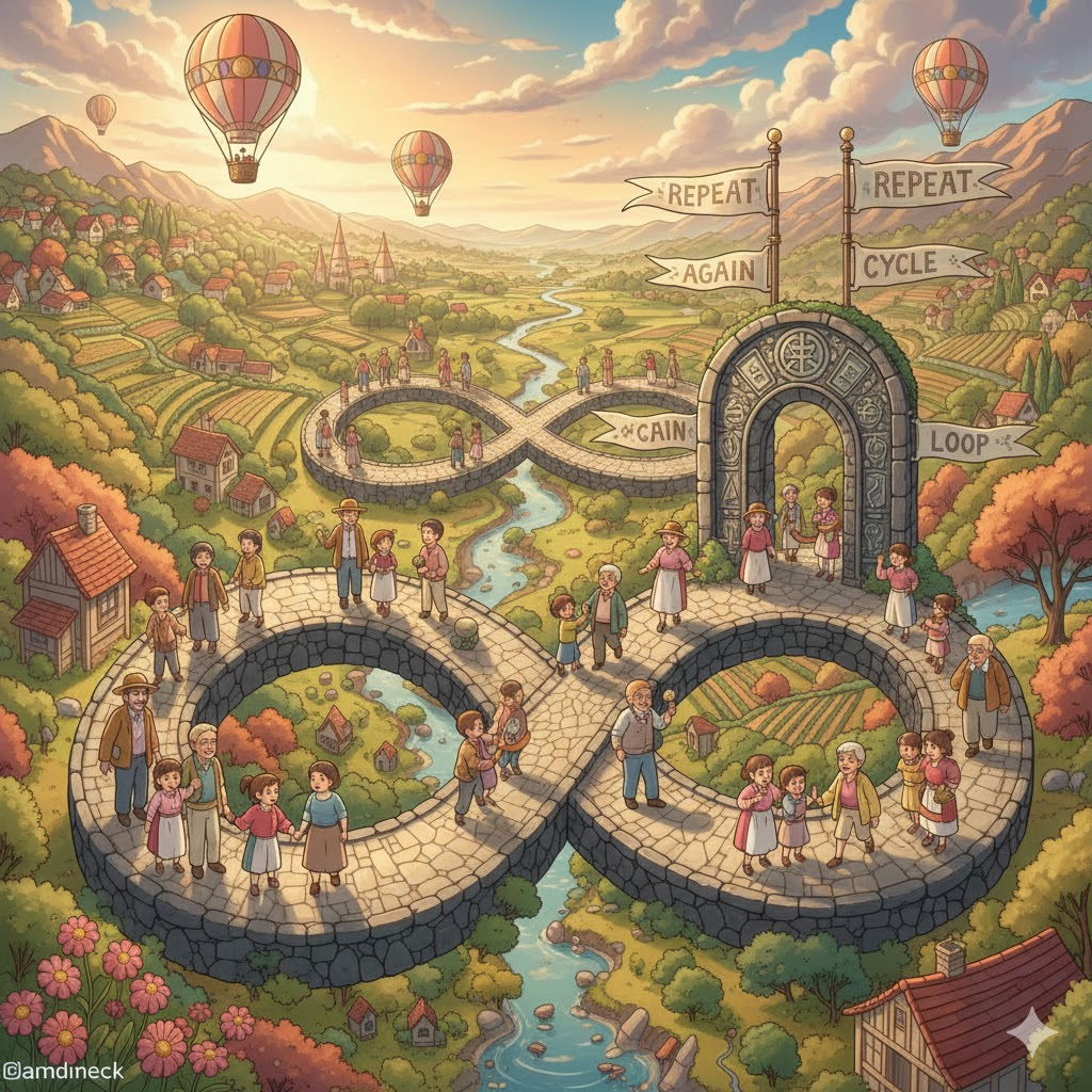 지속적인 반복, 역사적 순환. 끊임없이 되풀이되는 상태나 과거의 실수를 다시 겪는 것.