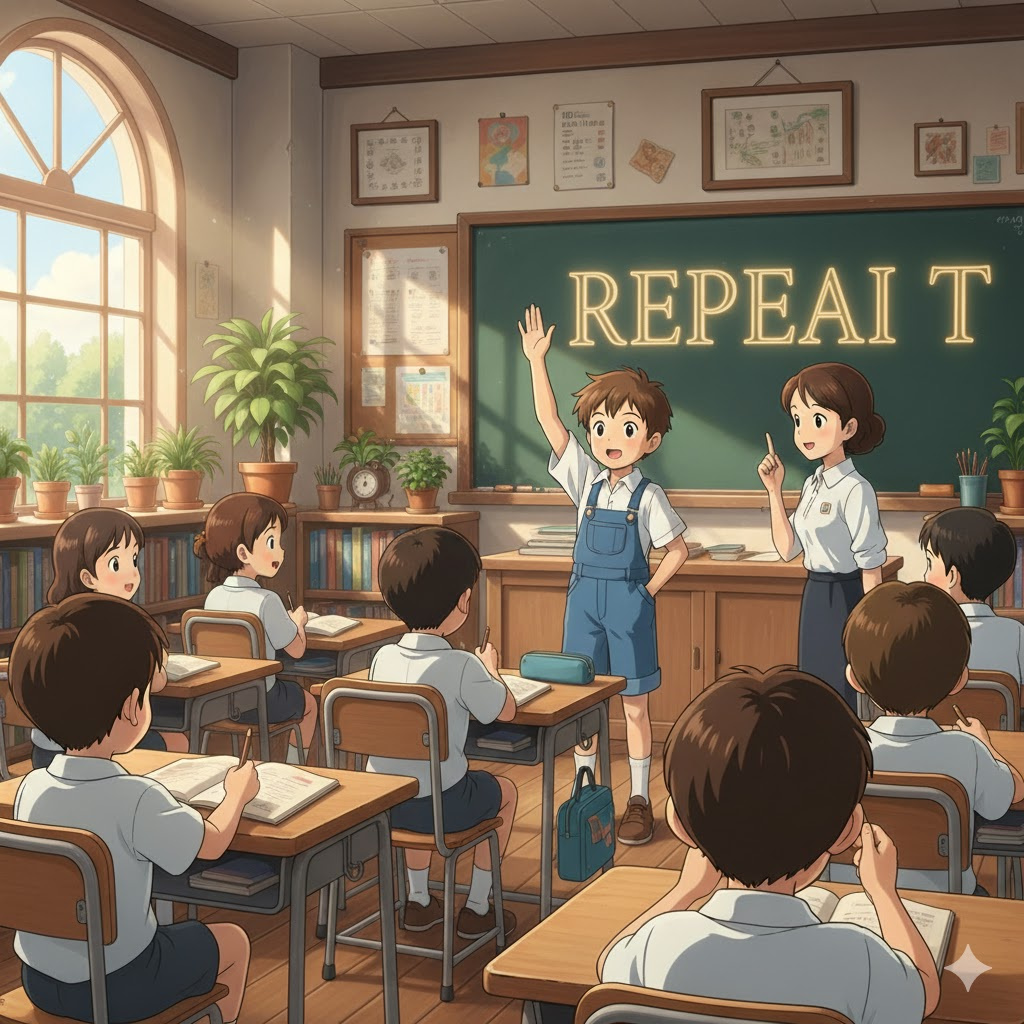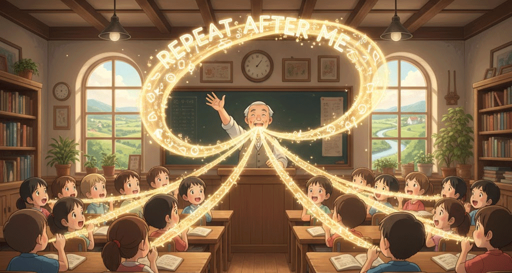 - 해석: 학습이나 암기를 위해 화자가 말한 것을 그대로 따라 말하도록 지시하는 행위. (교육, 언어 학습 지문에서 사용)