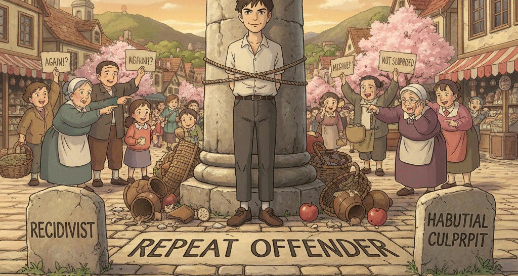 '이미'(already) '한' '번' 이상 '범죄'(crime)를 '저질러'(committed) '처벌'(punishment)을 '받았음'에도 불구하고, '다시'(repeat) '동일'하거나 '유사한'(similar) '범죄'(offense)를 '저지르는' '사람'(person)을 의미합니다. '교정'(correction)이나 '재활'(rehabilitation)의 '실패'(failure)를 암시하며, '법적'(legal) '제재'(sanction)를 '강화'(increase)하는 '대상'(target)이 됩니다.
