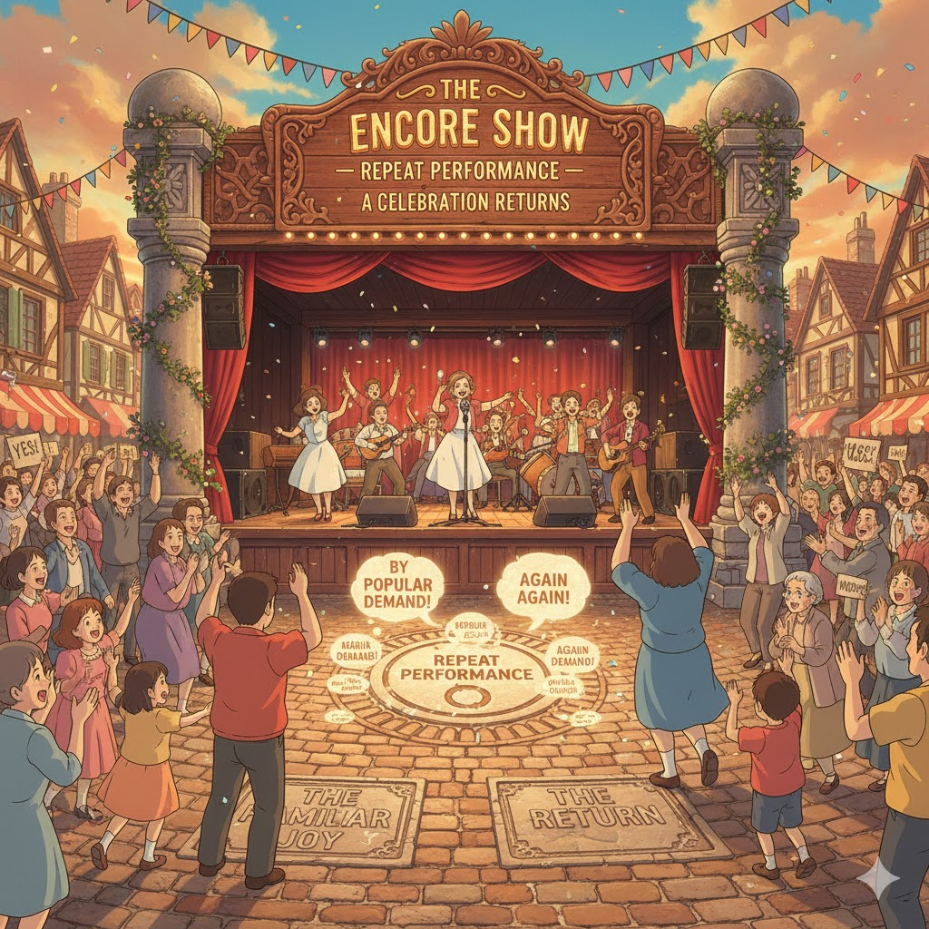 '이전'(former)에 '성공적'(successful)이거나 '주목'(attention)받았던 '공연'(performance)이나 '활동'(activity)을 '다시'(repeat) '수행'(perform)하는 행위를 의미합니다. 비유적으로는 '과거'(past)의 '상황'(situation)이나 '실수'(mistake)가 '예상대로'(expected) '다시'(again) '발생'(happen)하는 '일'의 '재현'(repetition)을 강조하는 데 사용됩니다.