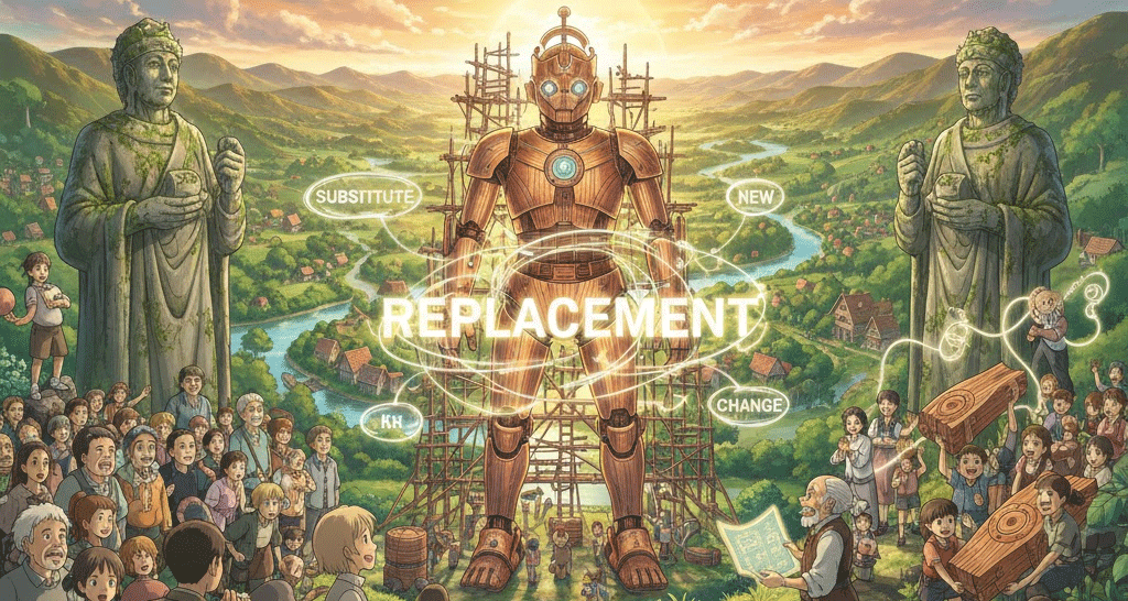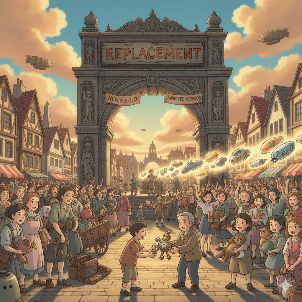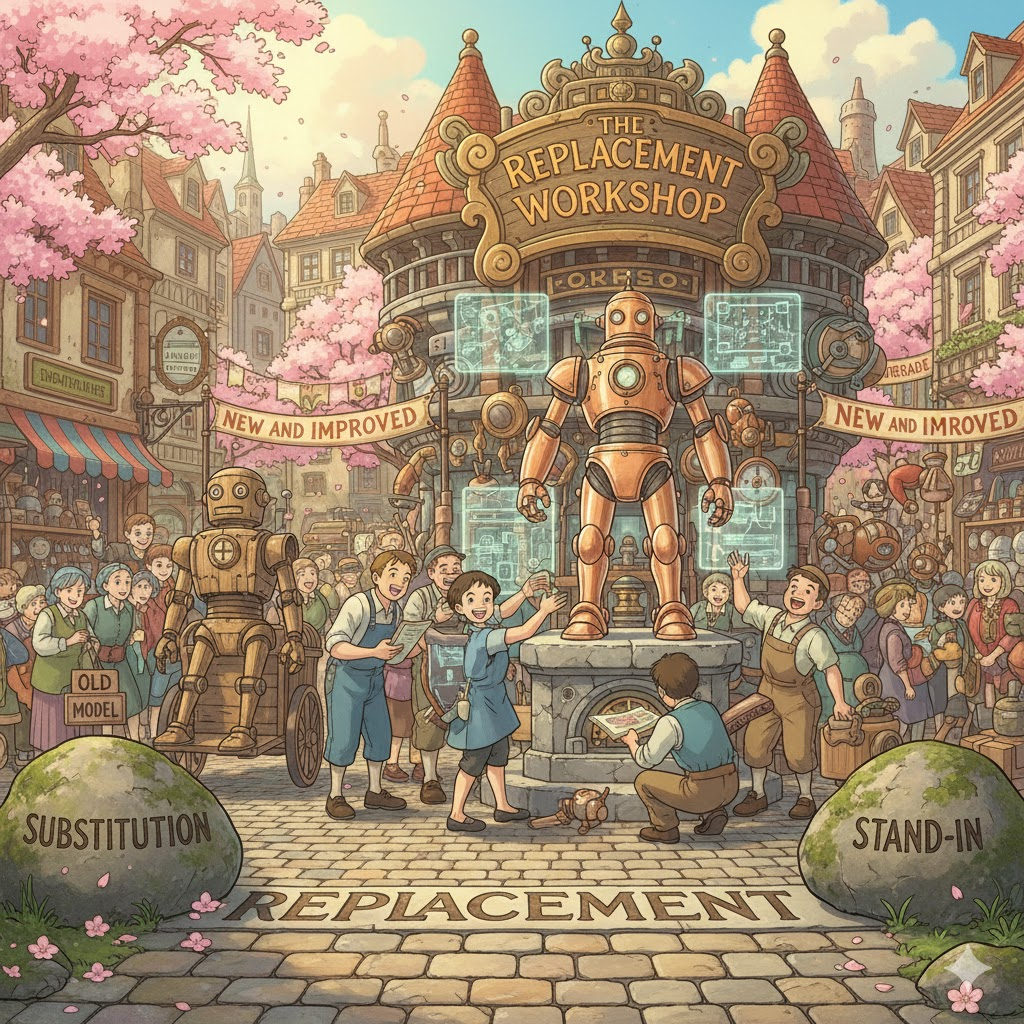 | 종합 뉘앙스 | 기존의 것이 고장, 노후, 부적합 등의 이유로 다른 새로운 것으로 자리를 바꾸는 행위 또는 새로운 것 자체. | '자리를 대신하는 것' |