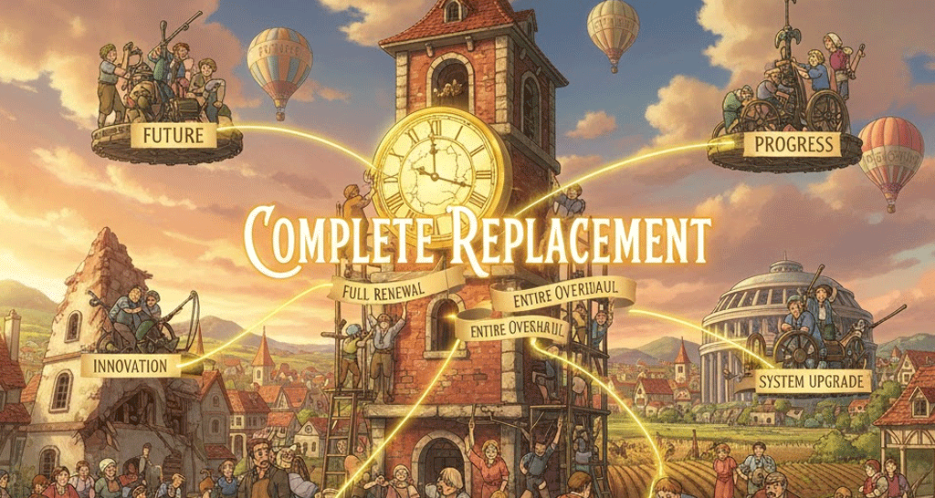 '부분'(part)이나 '일부'(portion)가 '아닌', '전체'(entire) '시스템'(system), '장비'(equipment), 또는 '손상'(damage)된 '물건'(item)을 '새로운'(new) 것으로 '완전히'(fully) '바꾸는'(replacement) 행위를 의미합니다. '수리'(repair) '불가능'(beyond repair)하거나 '비효율적'(inefficient)일 때 '취하는'(take) '조치'(action)를 강조합니다.