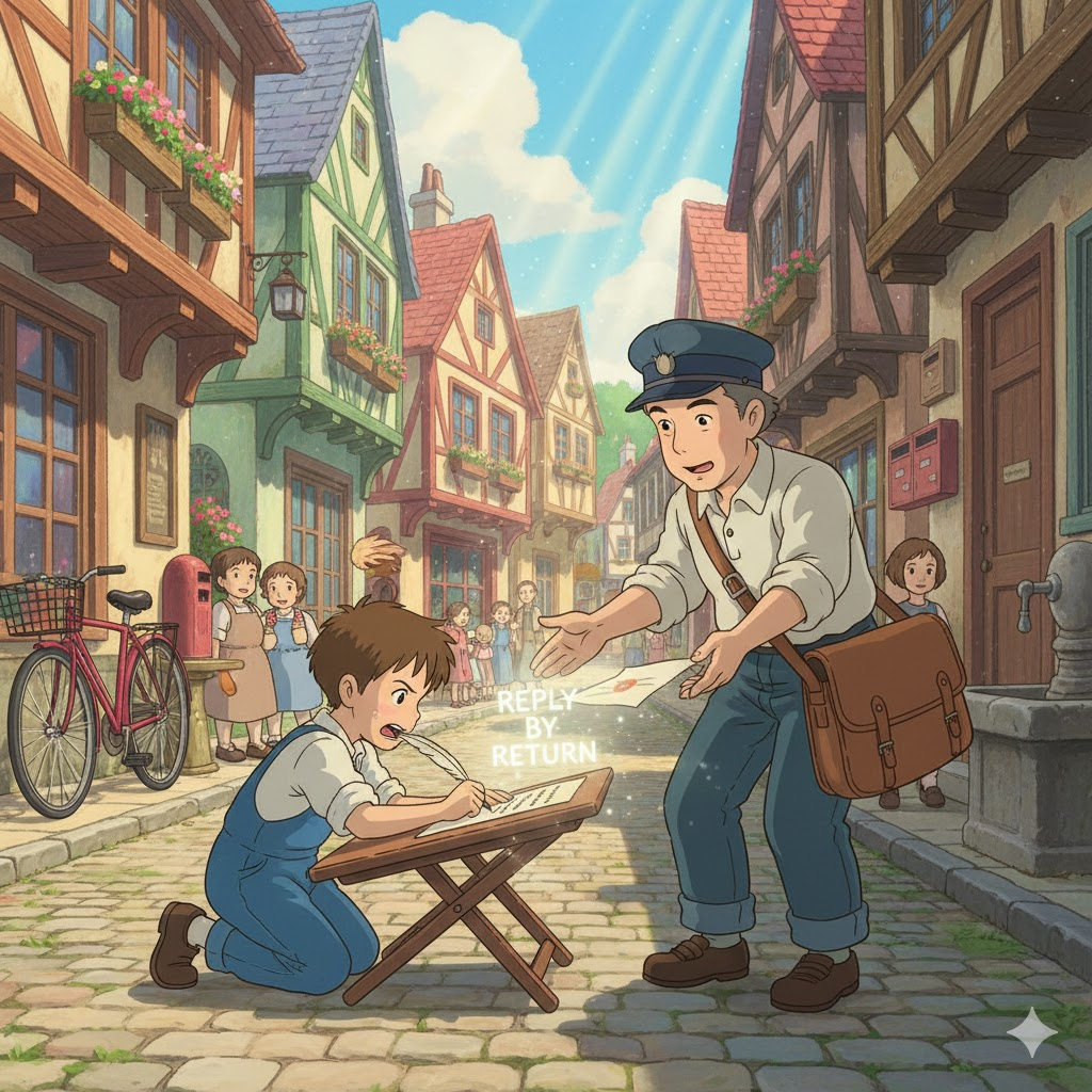 - 예문: The important invitation requested that guests reply by return of post to confirm attendance. (그 중요한 초대장은 참석 확인을 위해 손님들이 우편으로 즉시 회신할 것을 요청했다.)